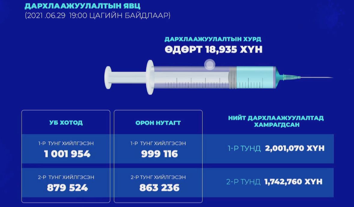 Улсын хэмжээнд вакцины эхний тунг тариулсан хүний тоо 2 саяыг давсан бол бүрэн тунд хамрагдсан 1.7 сая иргэн байна.