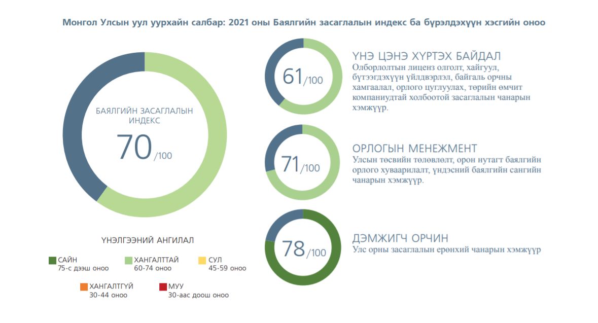 Баялгийн засаглалын 2021 оны индексээр Монгол Улсын уул уурхайн салбар “хангалттай” үнэлгээгээ хадгалсан бөгөөд өмнөх үнэлгээнээс хойш бага зэрэг ахицтай байжээ.