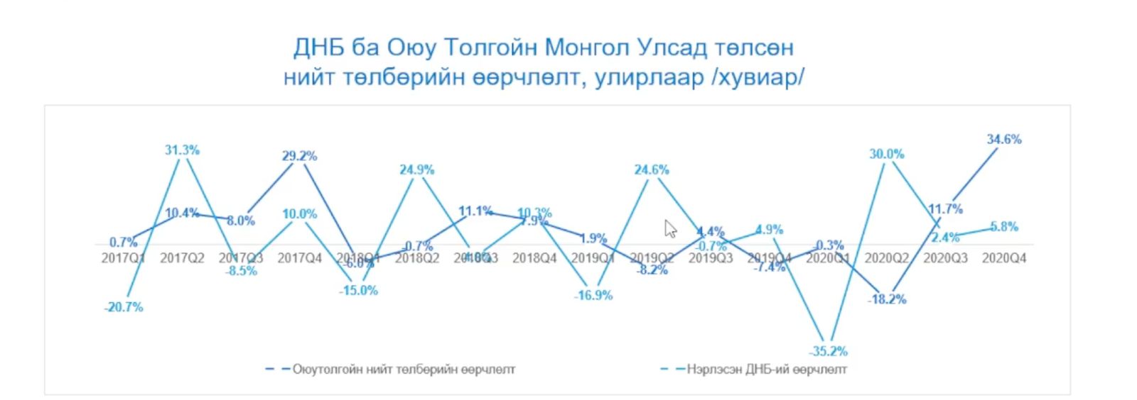 Оюутолгойн Монгол Улсад төлсөн нийт төлбөрийн өөрчлөлтийг улирлаар авч үзвэл манай улсын дотоодын нийт бүтээгдэхүүний өөрчлөлт өндөр хэлбэлзэлтэй бол Оюутолгойн төлсөн төлбөрийн хэлбэлзэл нь харьцангуй бага байна.
