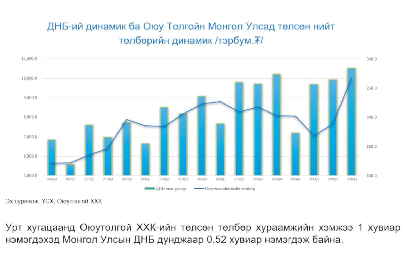 Гэхдээ Оюутолгойн улсад төлсөн төлбөр, татвар хураамж жил бүр нэмэгдэж байгаа. Хэдийгээр 2020 оны хоёрдугаар улиралд өмнөх улирлуудтай харьцуулахад буурсан боловч дөрөвдүгээр улиралд төлсөн дүн нь түүхэн дээд амжилтыг тогтоожээ.