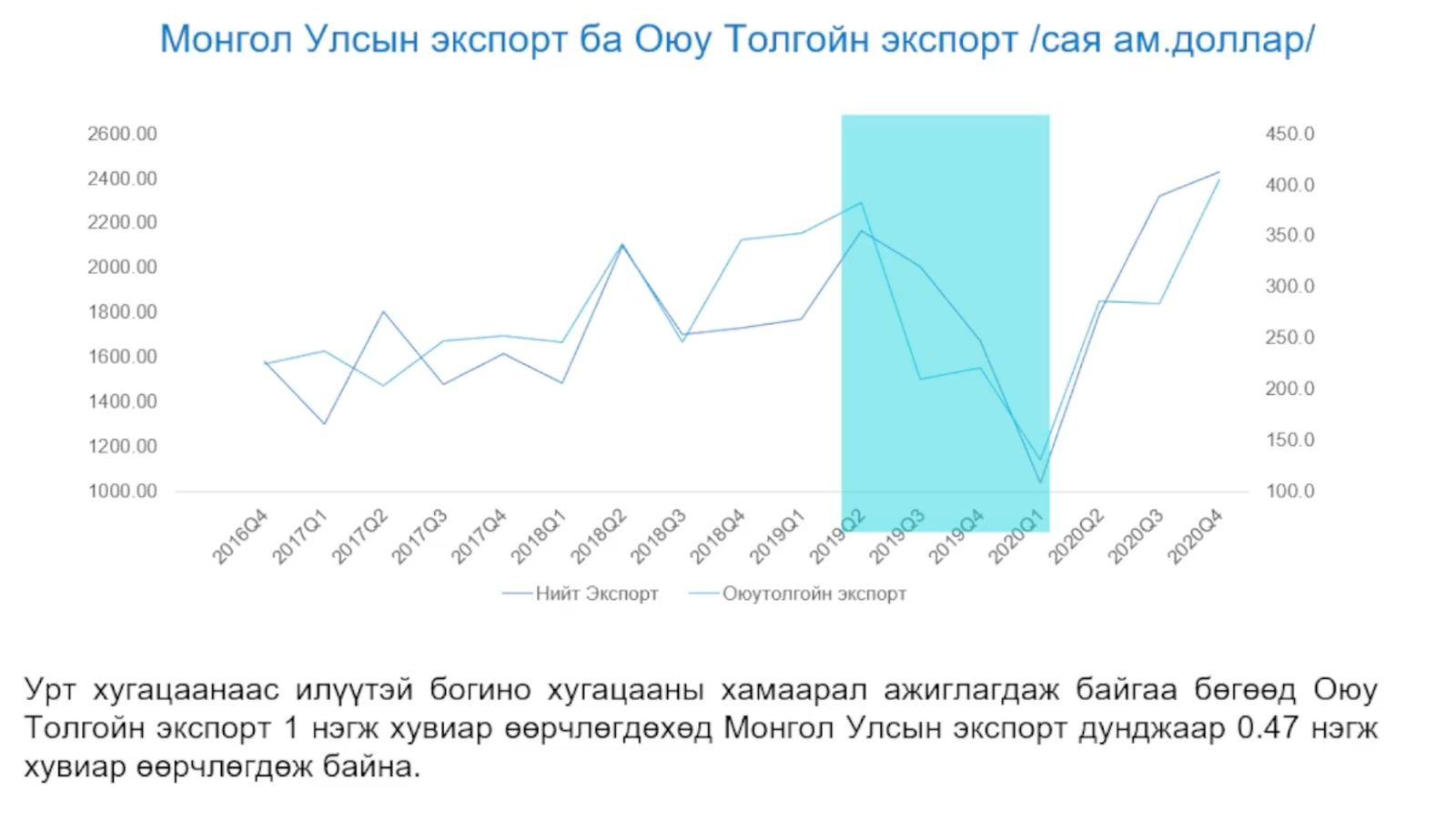 Түүнээс гадна урт хугацаанаас илүү богино хугацаанд хамаарал ажиглагдаж байгаа бөгөөд Оюутолгойн экспорт нэг нэгж хувиар өөрчлөгдөхөд Монгол Улсын экспорт дунджаар 0.47 нэгж хувиар өөрчлөгдөж байна” хэмээн ярив.