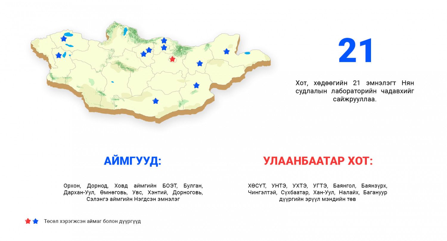 Үр дүнд нь улсын хэмжээнд тусламж үйлчилгээ үзүүлдэг лавлагаа шатлалын болон төрөлжсөн нарийн мэргэжлийн зарим эмнэлэг, дүүргийн болон аймгийн Нэгдсэн эмнэлэг, Эрүүл мэндийн төв, Бүсийн оношилгоо эмчилгээний төв зэрэг нийт 21 эмнэлэгт Нян судлалын лабораторийн чадавхийг сайжруулсан байна. Эмнэлгүүдийн Нян судлалын тасагт засвар хийж, Био аюулгүй ажиллагааны 2-р зэрэглэлийн лабораторид тавигдах шаардлагад нийцүүлэн орчин үеийн өндөр хүчин чадалтай тоног төхөөрөмжүүдийг суурилуулж, тэнд ажиллах эмч мэргэжилтнүүдийг олон удаагийн сургалтад хамруулж, чадавхжуулснаар манай улсын нян судлалын салбар шинэ шатанд хүрчээ.