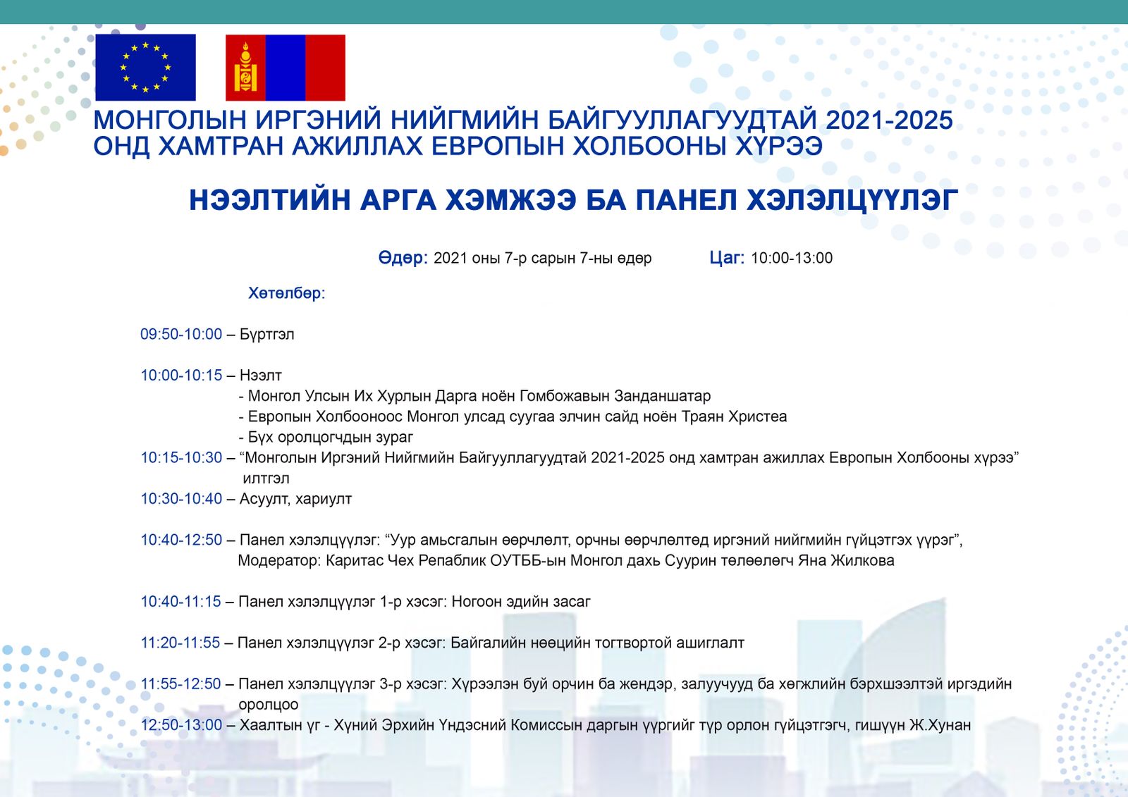 Энэхүү хамтын ажиллагааны хүрээг танилцуулахаар Европын Холбооноос Монгол Улсад cуугаа Төлөөлөгчийн газраас нээлтийн арга хэмжээ болон панел хэлэлцүүлгийг 2021 оны 07-р сарын 07-ны өдөр 10:00-13:00 цагт цахимаар зохион байгуулна.