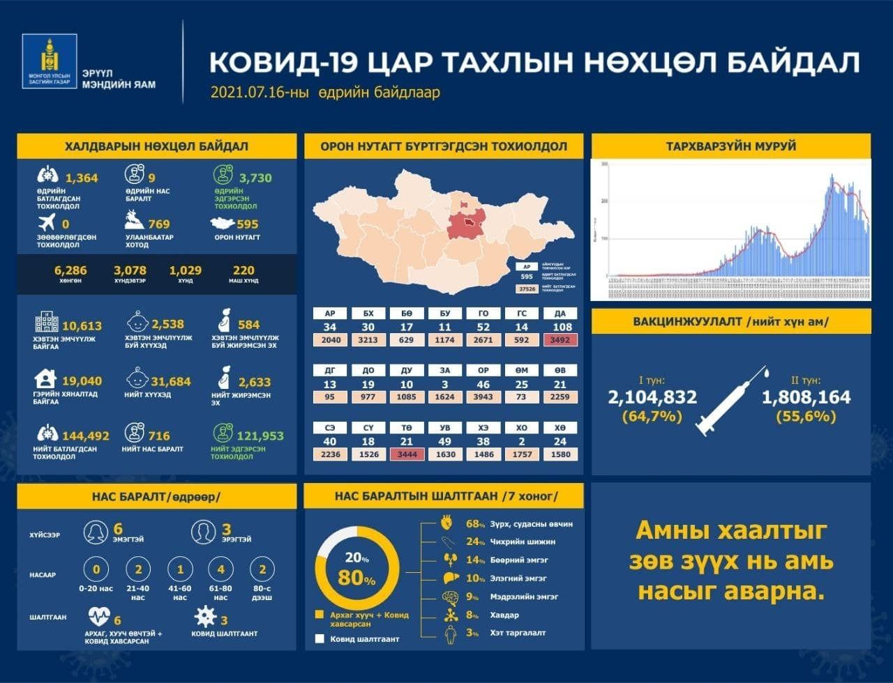Өнгөрсөн хоногт коронавирусийн халдварын 1,364 тохиолдол батлагдаж, 9 хүн нас баржээ. Шинээр батлагдсан тохиолдлын 769 нь Улаанбаатарт, 595 нь орон нутагт илэрсэн байна. Долдугаар сарын 11-нээс өдөрт 10-12 мянга орчим шинжилгээ хийж буйг ЭМЯ тодотгов.