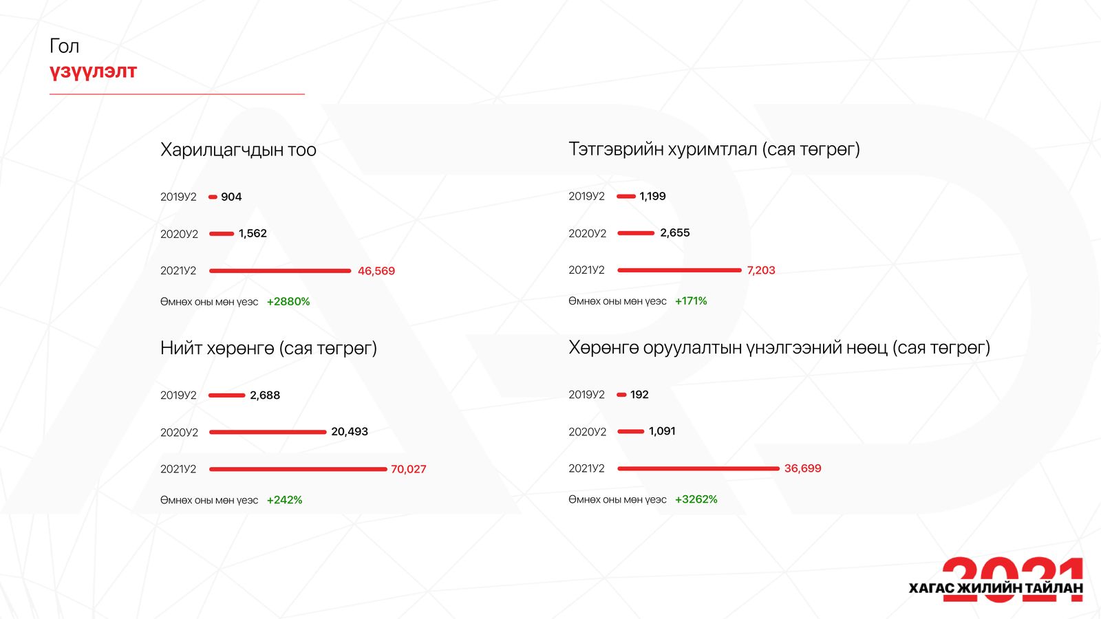 Санхүүгийн гүйцэтгэлийн хувьд 2021 оны II улирлын байдлаар харилцагчдын тоо 46,569-д хүрч, өмнөх оны мөн үетэй харьцуулахад 2880 хувиар, 2020 оны сүүлээс 346 хувиар өссөн үзүүлэлттэй байна. Ард Лайфын нийт хөрөнгө өмнөх оны мөн үеэс 242 хувиар өсөж 70 тэрбумд хүрсэн явдал нь бидний хамгийн том амжилтуудын нэг байлаа. Тэтгэврийн тогтолцоог шинэчлэхийн ач холбогдол, тэтгэврийн хуримтлал зэрэгтэй холбогдох мэдлэг боловсролыг албан байгууллага, иргэдэд цар тахлын үед цахимаар олгож байсан ба цаашид ч иргэдээ мэдлэг, мэдээллээр тогтмол ханган ажиллах болно.