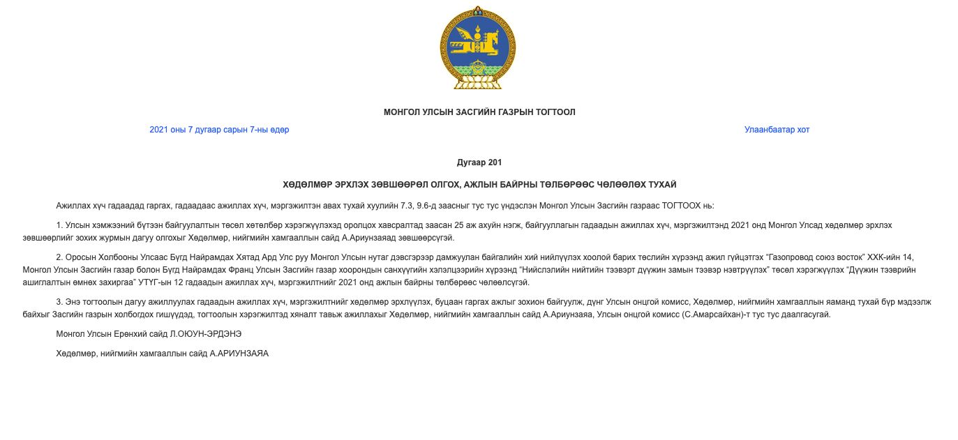 Түүнчлэн тус тогтоолоор ОХУ-аас БНХАУ руу Монгол Улсын нутаг дэвсгэрээр дамжуулан байгалийн хий нийлүүлэх хоолой барих төслийн хүрээнд ажил гүйцэтгэх “Газопровод союз восток” ХХК-ийн гадаадын 14 ажилтныг 2021 онд ажлын байрны төлбөрөөс чөлөөлөхөөр дурджээ.