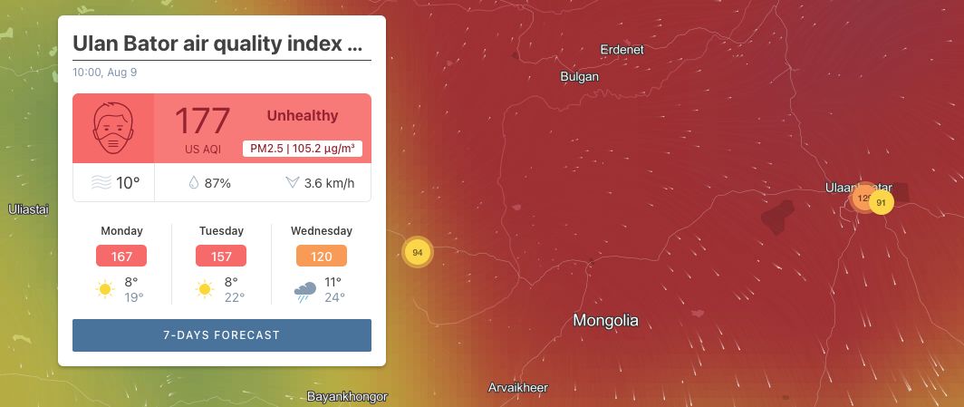Өнөөдрийн байдлаар ОХУ-ын Краснаярск хотод агаарын бохирдол хамгийн өндөр байгаа бол Улаанбаатар хот 17 дугаарт эрэмбэлэгджээ.