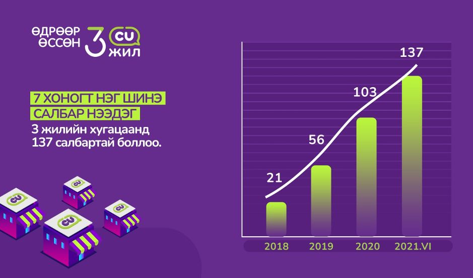 Монголын хамгийн олон салбартай CU конвиниенс сүлжээ дэлгүүр энэ сард гурван нас хүрч байна. Анх 2018 оны 8-р сард 6 салбар дэлгүүртэйгээр үйл ажиллагаагаа эхлүүлж байсан бол 7 хоног бүр 1 шинэ салбар нээж, өнөөдрийн байдлаар 137 салбар дэлгүүртэй болж өдрөөр өссөөр байна.