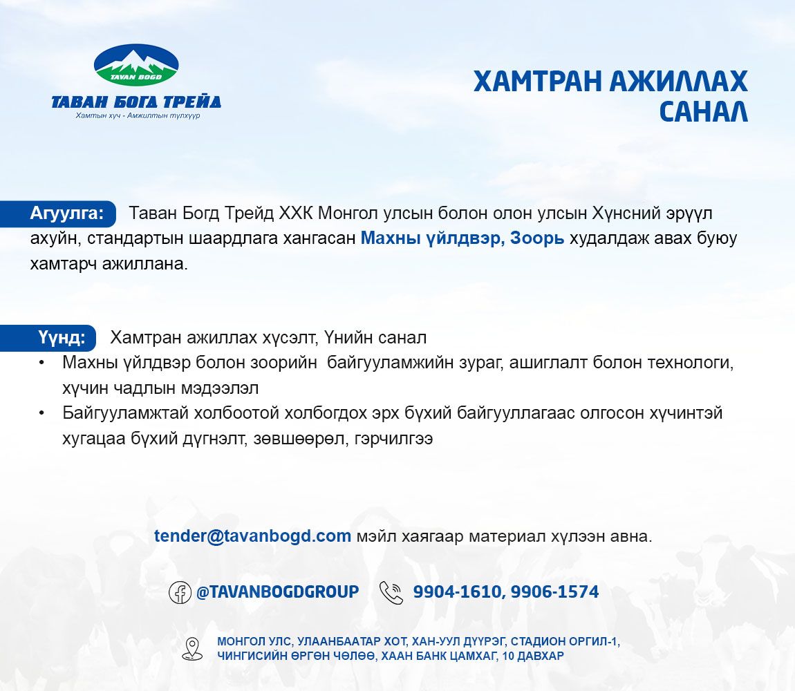 Таван Богд Группийн бизнесийн цар хүрээ өргөжин тэлж буйтай холбоотойгоор дараах хамтран ажиллах саналыг нээлттэй зарлаж байна. Та бүхэн хамтран ажиллах хүсэлт болон үнийн саналаа tender@tavanbogd.com хаягт илгээнэ үү.