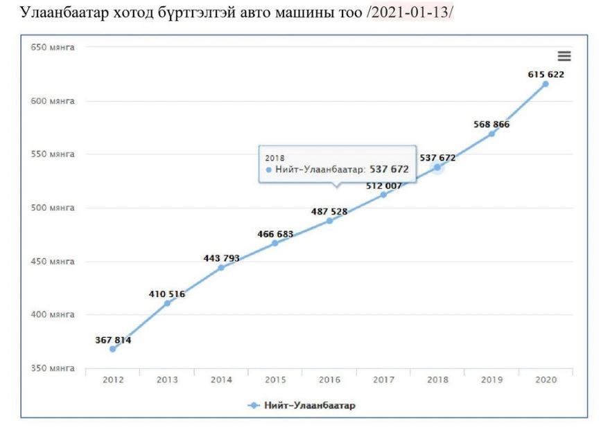 Энэ нь хотын хүн ам жилд дунджаар 2.5 хувиар өссөн гэсэн үг юм. Хотын хүн ам өсөхийн хэрээр тээврийн хэрэгслийн тоо мөн дагаж өссөн бөгөөд нийслэлд бүртгэлтэй тээврийн хэрэгслийн тоо 2012 онд 367.814 байсан бол 2020 онд 615.622 болж нэмэгджээ. Өөрөөр хэлбэл, найман жилийн хугацаанд тээврийн хэрэгслийн тоо бараг хоёр дахин нэмэгдэж, жилд дунджаар 6.7 хувиар өссөн байгаа юм.