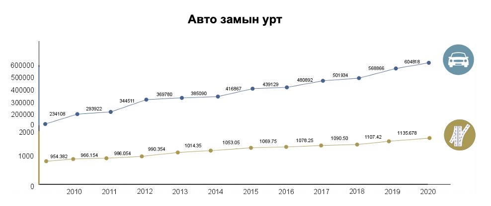 Гэтэл хотын авто замын нийт урт 2010 онд 954.4 км байсан бол 2020 онд 1,135.7 км болж, 10 жилийн хугацаанд ердөө 181.3 км-ээр нэмэгджээ. Тодруулбал, машины тоо хоёр дахин нэмэгдээд байхад авто замын урт ердөө 180 км-ээр нэмэгдсэн гэсэн үг. Энэ бол Улаанбаатар хотын түгжрэлийн үндсэн шалтгаан.
