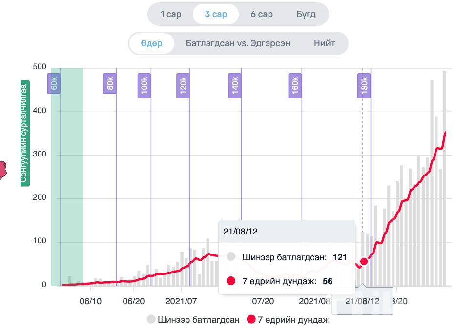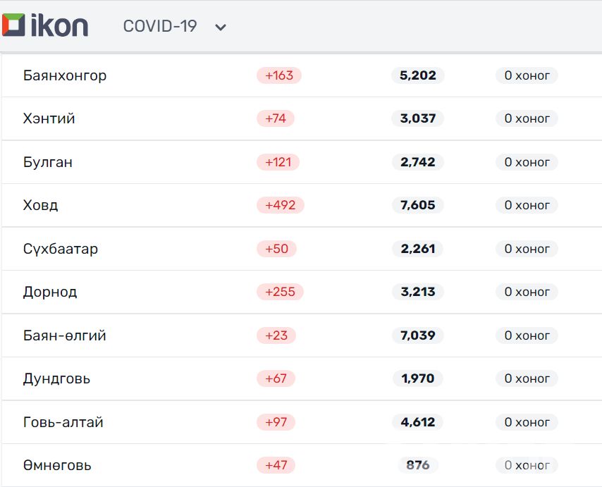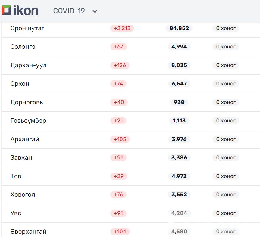 Тухайлбал, сүүлийн хоногт улсын хэмжээнд 2,740 хүнээс коронавирусийн халдвар илэрчээ. Үүний 2,213 нь буюу 80.7 хувь нь орон нутагт бүртгэгдсэн байна.