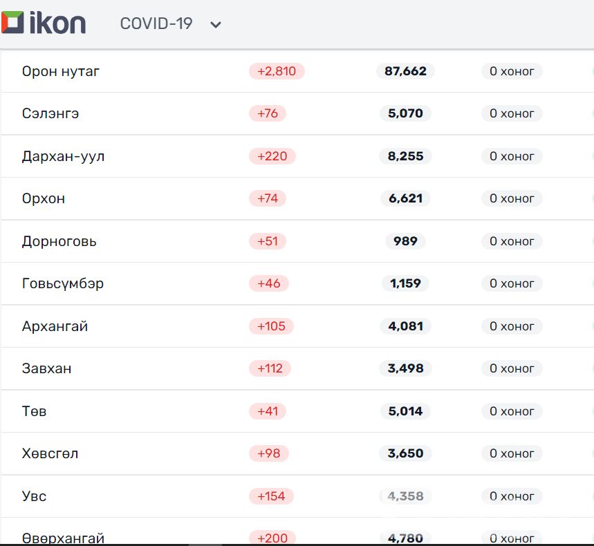Орон нутагт бүртгэгдсэн халдварын тохиолдол аймаг тус бүрээр: