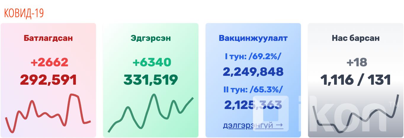 Нас баралтыг дотор нь ангилбал 41-80 насны иргэд байна. Үүнээс 10 нь эмэгтэй, 8 нь эрэгтэй. Тэдний нэг нь коронавирусийн шалтгаант нас баралт бол 17 нь архаг хууч өвчин, КОВИД-19 хавсарсан хэмээн Эрүүл мэндийн яамнаас мэдээллээ.