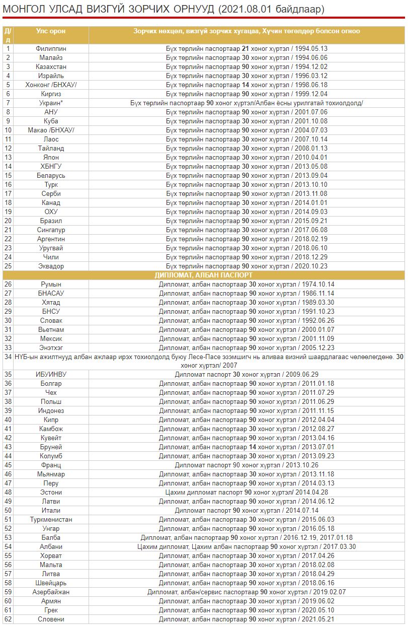 Монгол Улсад визгүй зорчих орнуудын жагсаалтыг Гадаадын иргэн харьяатын газраас танилцууллаа.