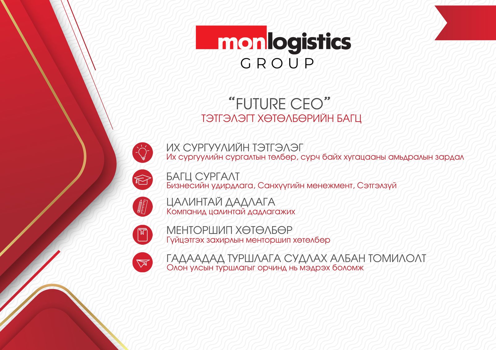 Монложистикс Групп нь өөрийн хүний нөөцийн бодлогын хүрээнд “Бусдыг хүчирхэгжүүлэх манлайллын соёл” үнэт зүйлээ баримтлан, оюутан залуусын ирээдүйн хөгжилд оюунлаг хөрөнгө оруулалт хийхээр анх удаа ирээдүйн манлайллын хөтөлбөр болох “Future CEO” хөтөлбөрийг санаачилж, 2021 оны Математикийн Элсэлтийн Ерөнхий шалгалтад улсын хэмжээнд 800 оноо авсан 26 төгсөгчөөс шилдэг 3 оюутныг шалгаруулан нийт 120 сая төгрөгийн багц бүхий тэтгэлэгт хөтөлбөрийн эрхийг батламжийн хамт гардуулан, гэрээнд гарын үсэг зурж баталгаажууллаа.