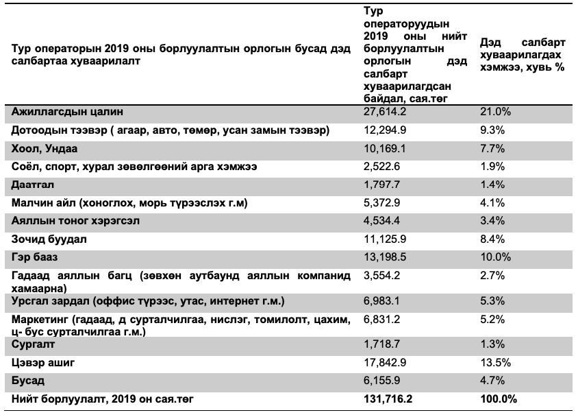 Тухайн жилд 490, 2020 онд 570 тур оператор үйл ажиллагаа явуулсан бөгөөд судалгаанд 252-ыг нь хамруулжээ. Эдгээрээс 56% нь орлогын талаарх асуултад хариулт өгснөөс харвал 2019 онд жилийн борлуулалтын орлого 131.7 тэрбум төгрөг (49.7 сая ам доллар) байсан ба энэ нь аялал жуулчлалын компанитай уялдаатай ажилладаг бусад салбарт дахин хуваарилагдаж, дам үр нөлөө үзүүлсэн хэмээн тооцсон байна. Бусад салбарт хэрхэн хуваарилагдаж байгааг доорх зургаас харна уу.