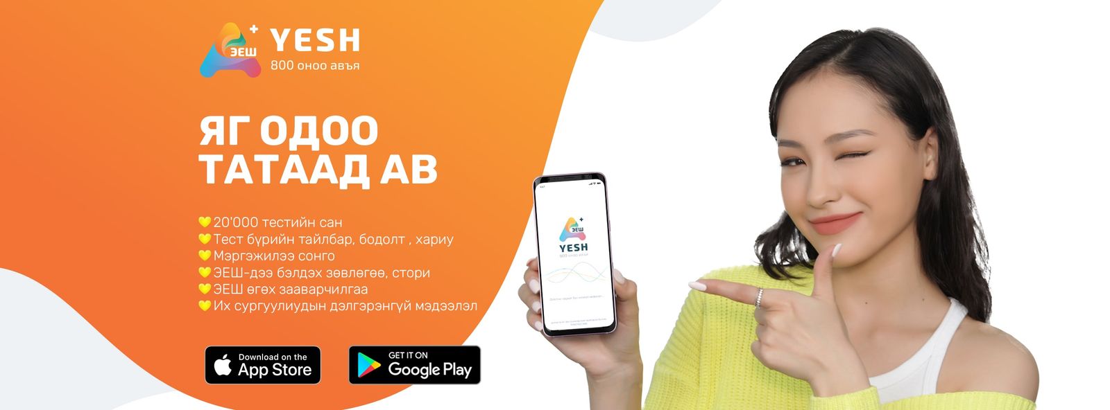 YESH аппликейшныг энэ намар ЭЕШ өгсөн шалгалт өгсөн нийт 40000 хүүхдийн 4 хүүхэд тутмын 1 нь ашиглаад өөрсдийн зорьсон зорилгоо биелүүлж хүссэн их сургуулийнхаа босго оноог зоволгүй даваад гараад ирснийг дуулгахад таатай байна. Цахим, танхим хосолсон ирж буй жилдээ цөмөөрөө, бүгдээрээ, найзуудтайгаа, ангиараа YESH-ээ машиндаад ЭЕШ-дээ хүссэн амжилтаа үзүүлэхийг амлаж байна. Амжилт.