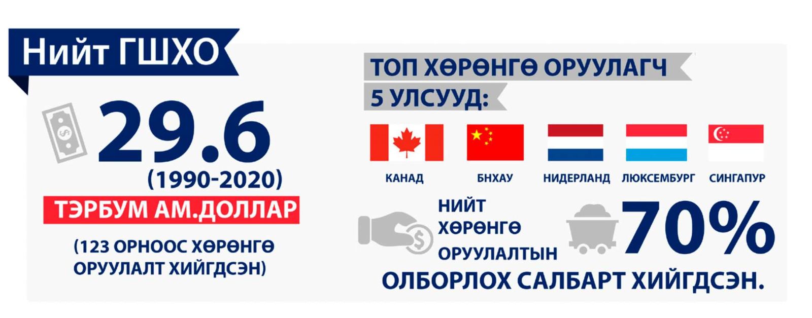 Эндээс нийт хөрөнгө оруулалтын 40% нь Оюутолгой төсөлд ногддог. Хөрөнгө оруулагчдын тооны хувьд гэвэл Гадаадын иргэн, харьяатын газрын мэдээгээр 1,834 гаднын хөрөнгө оруулагч Монголд бүртгэлтэй байгаа нь маш цөөхөн.