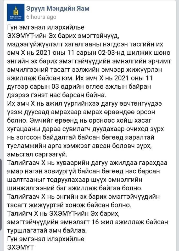 Мөн талийгаачийг ЭХЭМҮТ-ийн Эх барих, эмэгтэйчүүдийн эмнэлэгт 16 жил ажиллаж байсан туршлагатай эмч байсныг онцлоод гүн эмгэнэл илэрхийлжээ.
