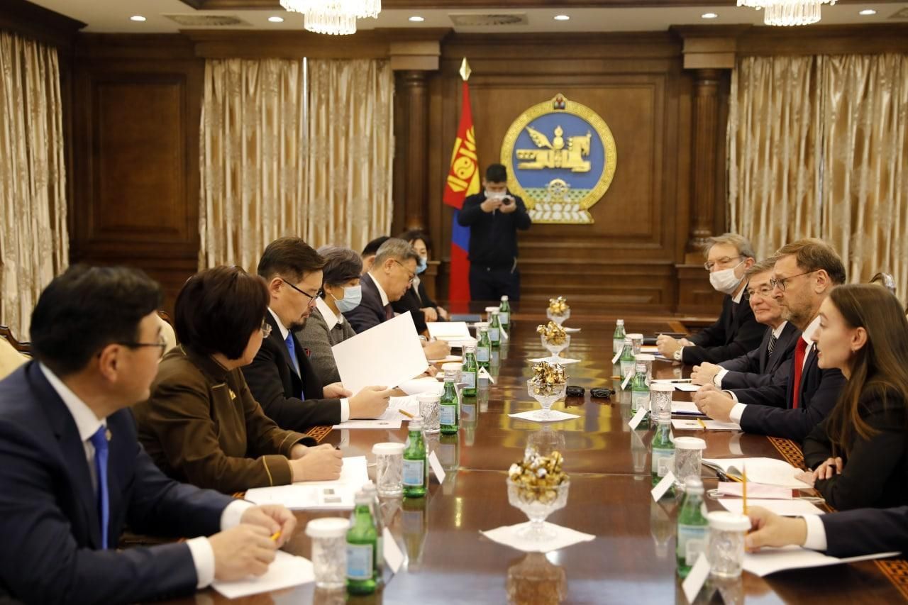 Монгол, Оросын хооронд дипломат харилцаа тогтоосны 100 жилийн ойн арга хэмжээний хүрээнд манай улсад айлчилж буй ОХУ-ын Холбооны Хурлын Холбооны Зөвлөлийн орлогч дарга Константин Иосифович Косачев тэргүүтэй төлөөлөгчдийг Монгол Улсын Их Хурлын дарга Г.Занданшатар өнөөдөр (2021.11.05) хүлээн авч уулзлаа.