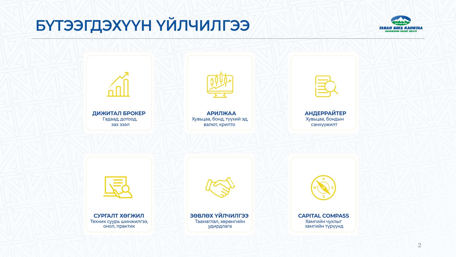 Таван Богд Капитал ҮЦК нь дотоодын зах зээлд хамгийн найдвартай компаниудын бондыг гаргаж, харилцагчдадаа эрсдэл багатайгаар мөнгөө өсгөх боломжийг нээж өгнө. Мөн гадаадын зах зээлд хөрөнгө оруулалт хийхэд харилцагчдынхаа найдвартай түнш нь болж ажиллахаар төлөвлөж байна. Үүнийг хэрэгжүүлэхдээ харилцагчаа хувьцаа сонгоход нь мэдээлэл, судалгаагаар тогтмол хангаж ажиллах юм. Товчхондоо, Харилцагч хувьцаа авахаас эхлээд, зарах хүртэлх бүхий л хугацаанд Таван Богд Капитал ҮЦК-ийн баг тантай хамт байна гэсэн үг. Мэдээж энэ бүгдийг технологийн дэвшил ашиглан дижитал хэлбэрээр зохион байгуулах юм.