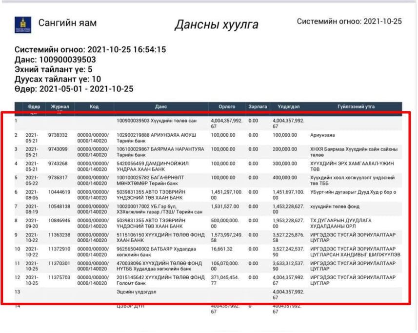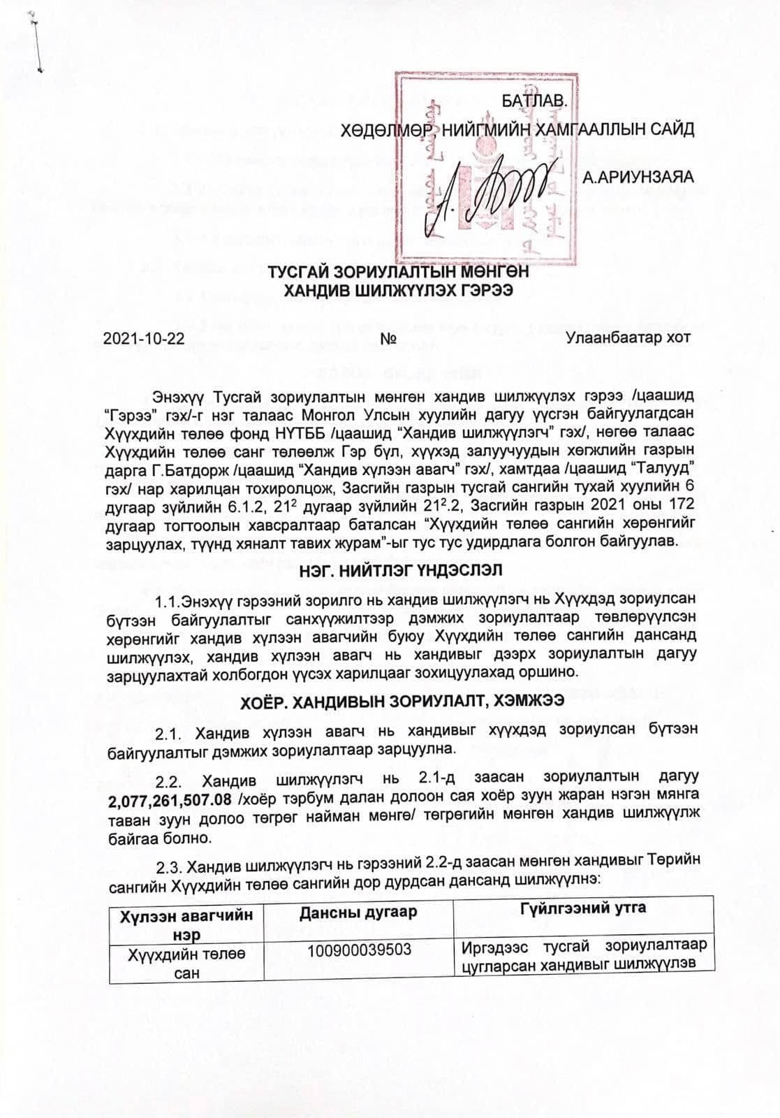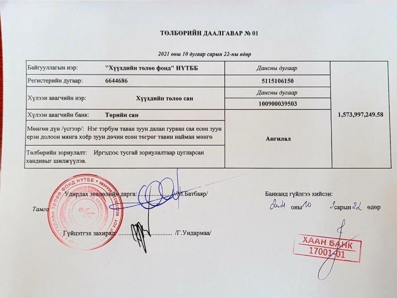 Жич: Шилжүүлгийн баримтууд болон, харилцах (харилцах дансанд хүү бодогддоггүй болно) дансны мэдээлэл, хандив шилжүүлэх гэрээг баримт болгон хавсаргав.