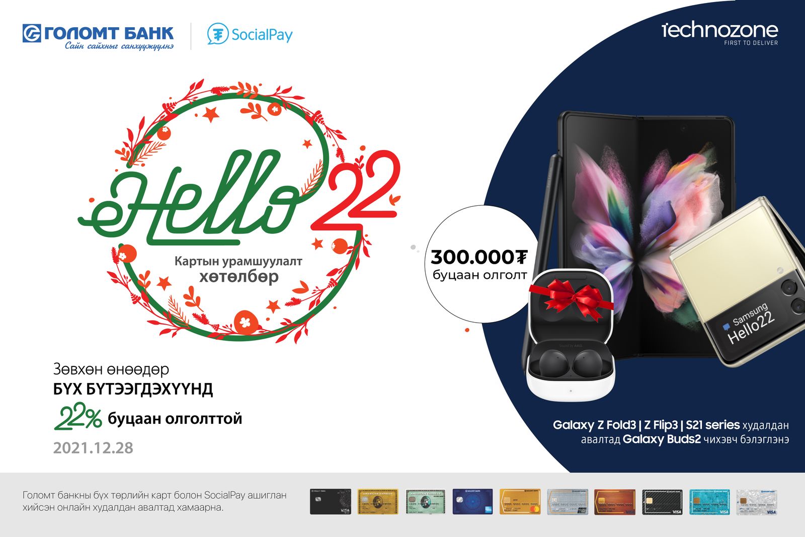 Samsung, Huawei, Apple, Xiaomi брэндийн Монгол дахь албан ёсны Дистрибьютер Технозон компани шинэ оныг угтан “Hello22” онлайн худалдан авалтын урамшууллыг Голомт банктай хамтран зарлаж байна.