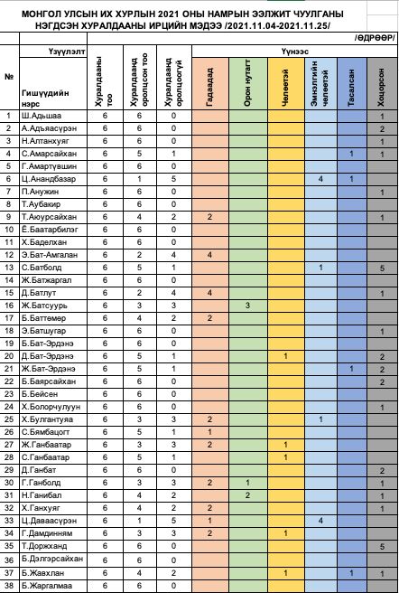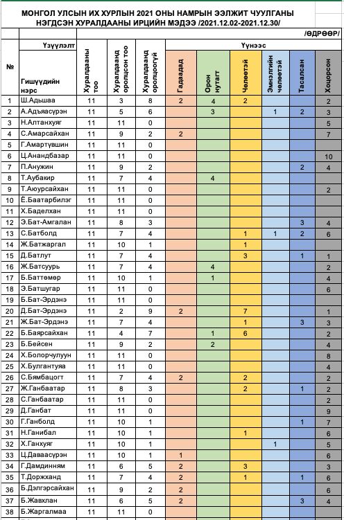 Монгол Улсын Их Хурлын Хуралдаан зохион байгуулах хэлтсээс 2021 оны намрын ээлжит чуулганы арваннэг, арванхоёрдугаар саруудын гишүүдийн ирцийн мэдээллийг танилцуулав.