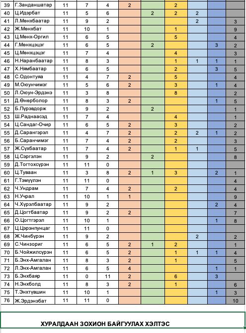 Харин арваннэгдүгээр сарын хамгийн их хоцролттой гишүүдээр С.Батболд, Т.Доржханд, Ж.Мөнхбат, Д.Цогтбаатар нар тодорсон байна. Тэд зургаан удаагийн хуралдааны тавд нь хоцорч оролцсон аж.