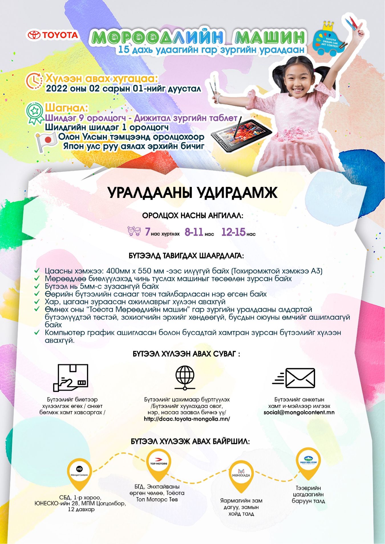 Үндэсний ялагч болж, Монголынхоо нэрээр олон улсын хүүхдүүдийн бүтээлүүдтэй өрсөлдөх боломжийг олгох 15 дахь удаагийн “Мөрөөдлийн машин” гар зургийн уралдаанд оролцогчдын бүтээлийг 2022 оны хоёрдугаар сарын 1-н хүртэл хүлээн авах юм.