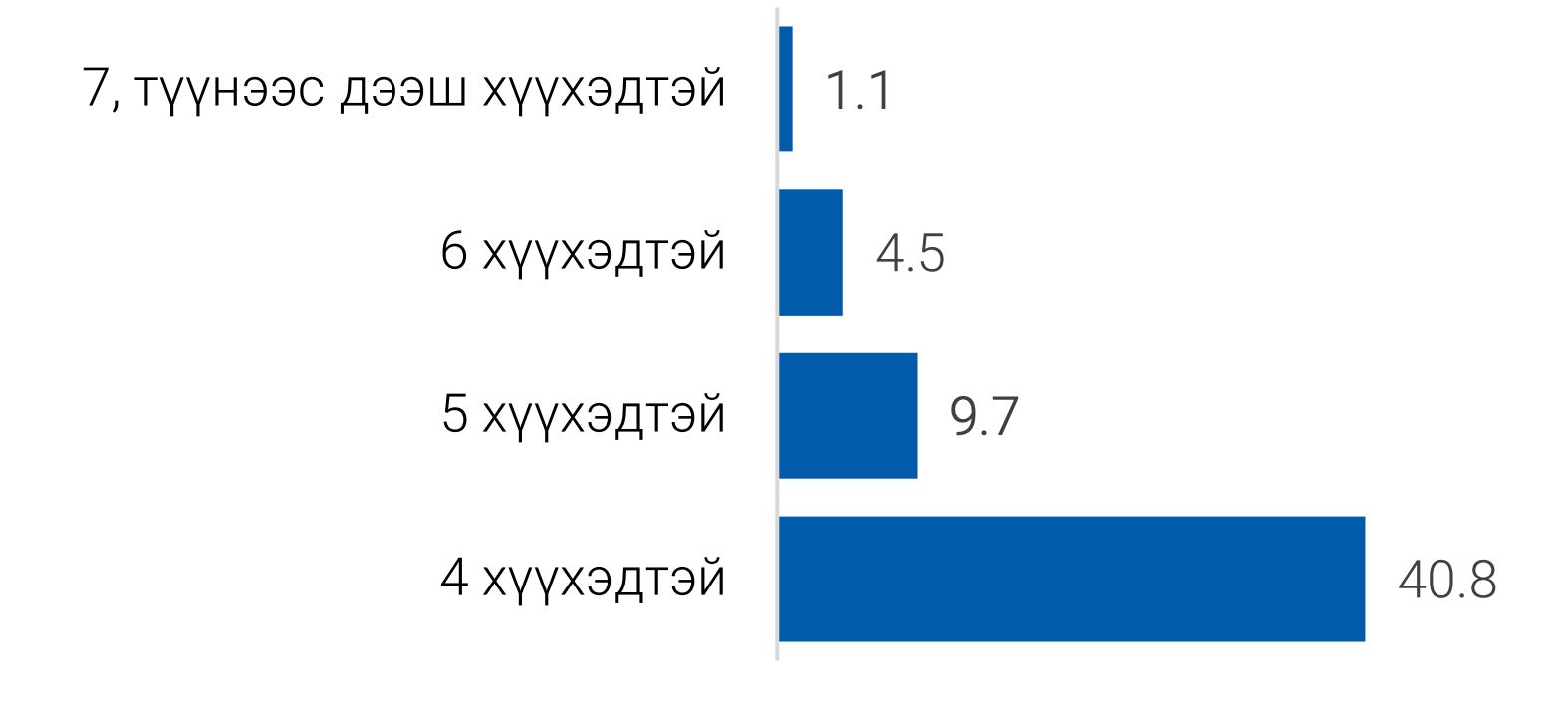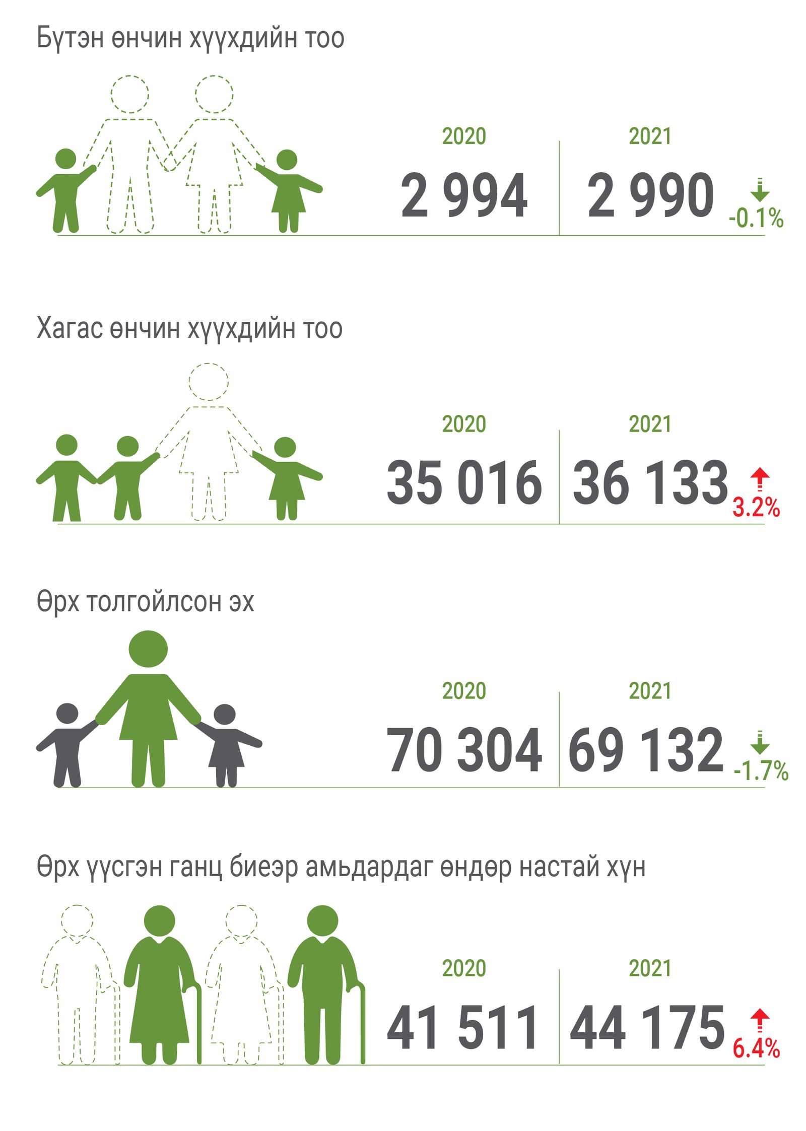18 хүртэлх насны 4 ба түүнээс дээш хүүхэдтэй өрхийн тоо 2021 оны эцэст 56.1 мянга болж, өмнөх оноос 4,435 (8.6%)-аар өсжээ. Эдгээр өрхийг хүүхдийн тоогоор ангилж харвал нийт 18 хүртэлх насны 4, түүнээс дээш хүүхэдтэй өрхийн