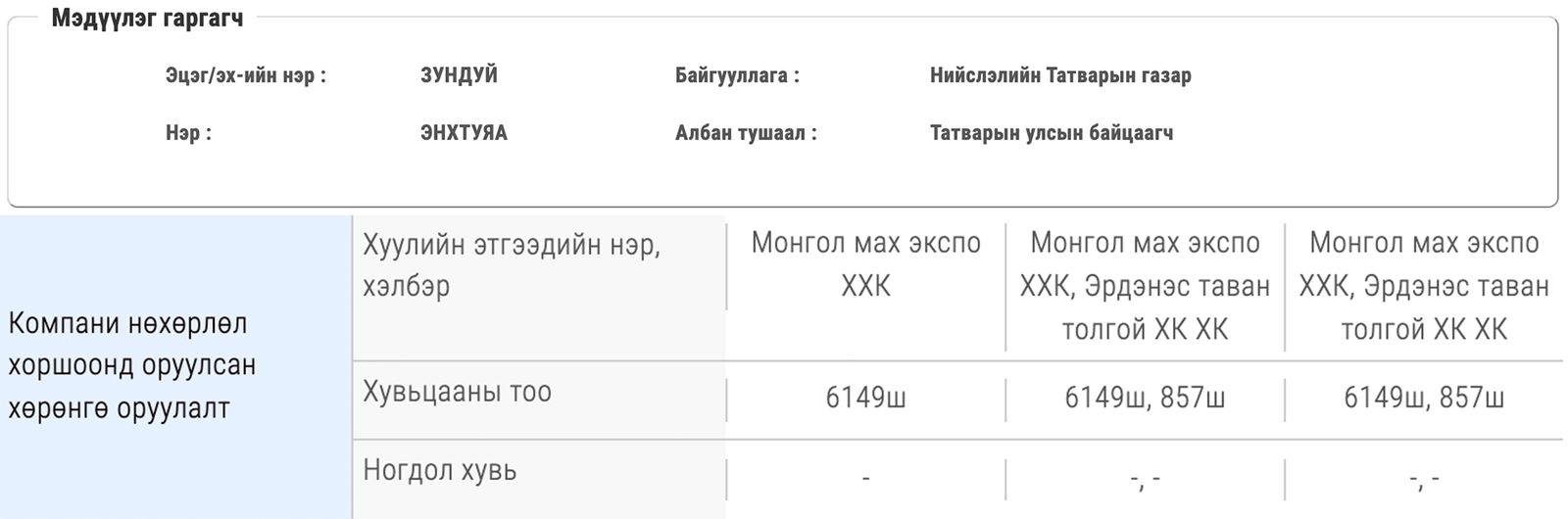 Нийслэлийн татварын газрын татварын Улсын байцаагч З.Энхтуяа 2017 онд Монгол мах экспо ХХК-ийн 6,149 ширхэг хувьцааг эзэмшдэг болохоо мэдүүлж байсан байна.
