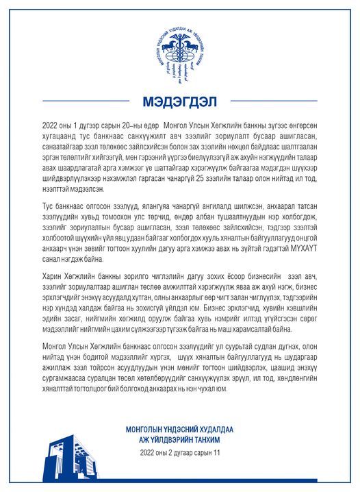 Монгол Улсын Хөгжлийн Банкны зээлтэй холбоотойгоор Монголын Үндэсний худалдаа аж үйлдвэрийн танхим мэдэгдэл гаргалаа.