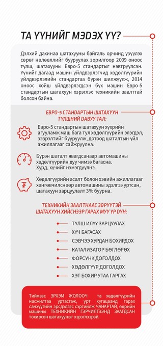 Машины техникийн гэрчилгээн дээр нь ямар төрлийн шатахуун хэрэглэх ёстойг үйлдвэрлэгчээс заасан байдаг. Монголчууд машинаа дасгах буюу заалтын бус, октан доогуур шатахууныг хэрэглэдэг нь буруу юм. Ялангуяа 2014 оноос хойш үйлдвэрлэгдсэн, бидний ярьдгаар “он залуу” авто машинууд бүгд байгальд ээлтэй Евро стандартын шатахууныг хэрэглэх заалттай. Монголд одоогоор Евро-5 стандартын (дэлхийд 2009 оноос ашиглаж эхэлсэн) 92, 95, 98, дизель түлш худалдаалагдаж байна. Евро-5 стандартын шатахуун нь зарцуулалтыг 3% бууруулдаг байна.