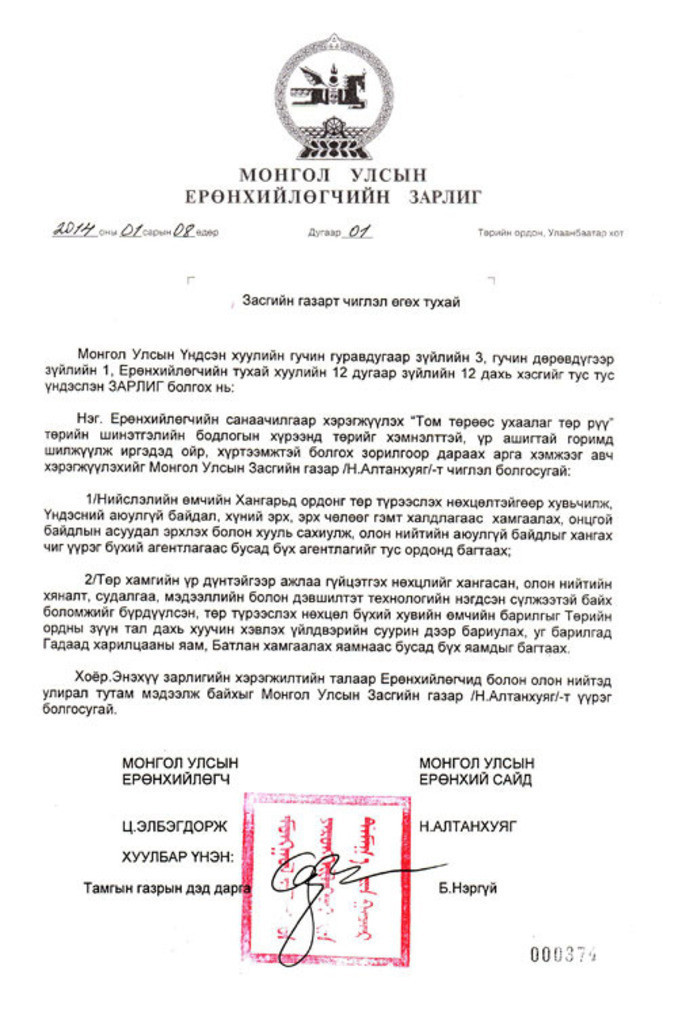 Засгийн газарт чиглэл өгөх тухай уг зарлигт Ерөнхийлөгчийн санаачилгаар хэрэгжүүлэх “Том төрөөс ухаалаг төр рүү” төрийн шинэтгэлийн бодлогын хүрээнд төрийг хэмнэлттэй, үр ашигтай горимд шилжүүлж иргэдэд ойр, хүртээмжтэй болгох зорилгоор хэд хэдэн арга хэмжээг авч хэрэгжүүлэхийг Монгол Улсын Засгийн газар /Н.Алтанхуяг/-т чиглэл болгосон байна.