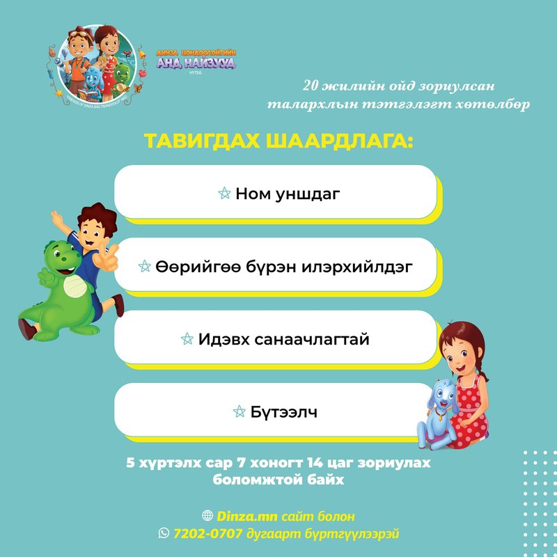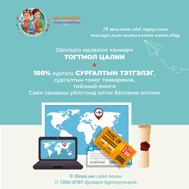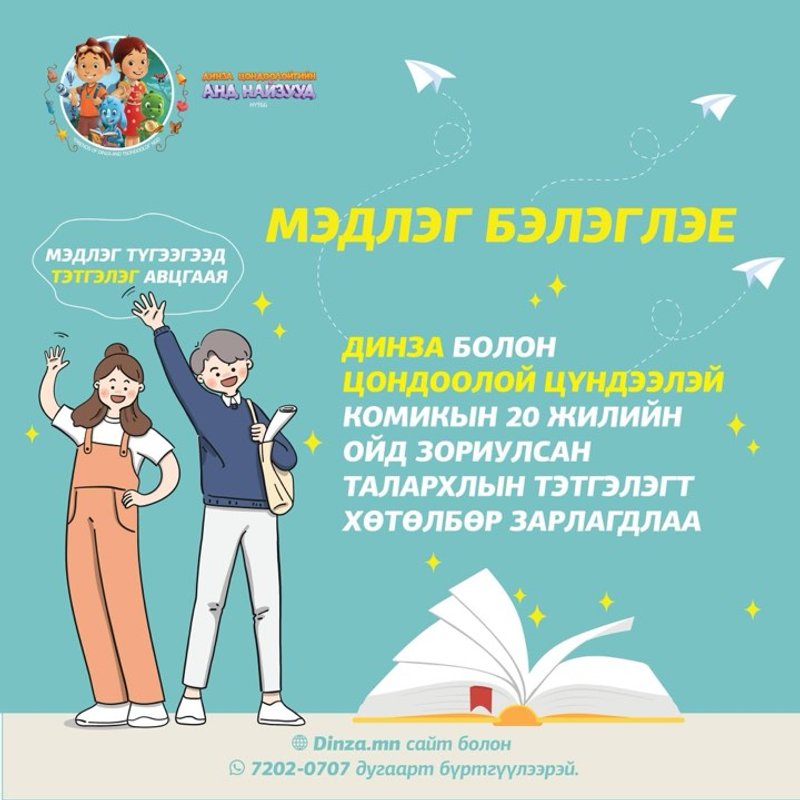 Монгол хүүхэд бүрийн хайртай Динза болон Цондоолой Цүндээлэй комик номын анхны уншигчдад гайхалтай мэдээг дуулгая. Энэ бол “МЭДЛЭГ БЭЛЭГЛЭЕ” ТЭТГЭЛЭГТ ХӨТӨЛБӨР юм. Хэрвээ чи Динза болон Цондоолой комикыг уншиж байсан бол энэ хөтөлбөрт орж сургалтын тэтгэлэг авч, орлоготой, олон нийттэй харилцах туршлагатай, гэр бүл ойр дотнынхныхоо бахархал болж, ээж аавынхаа зарим нэг асуудлыг төвөггүйхэн шийдэх боломжтой юм.