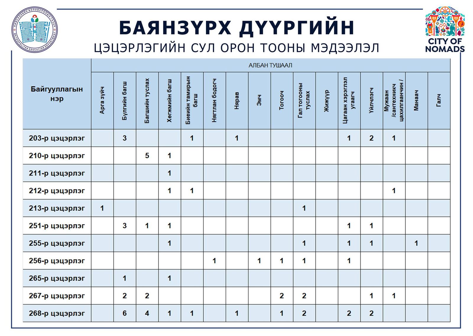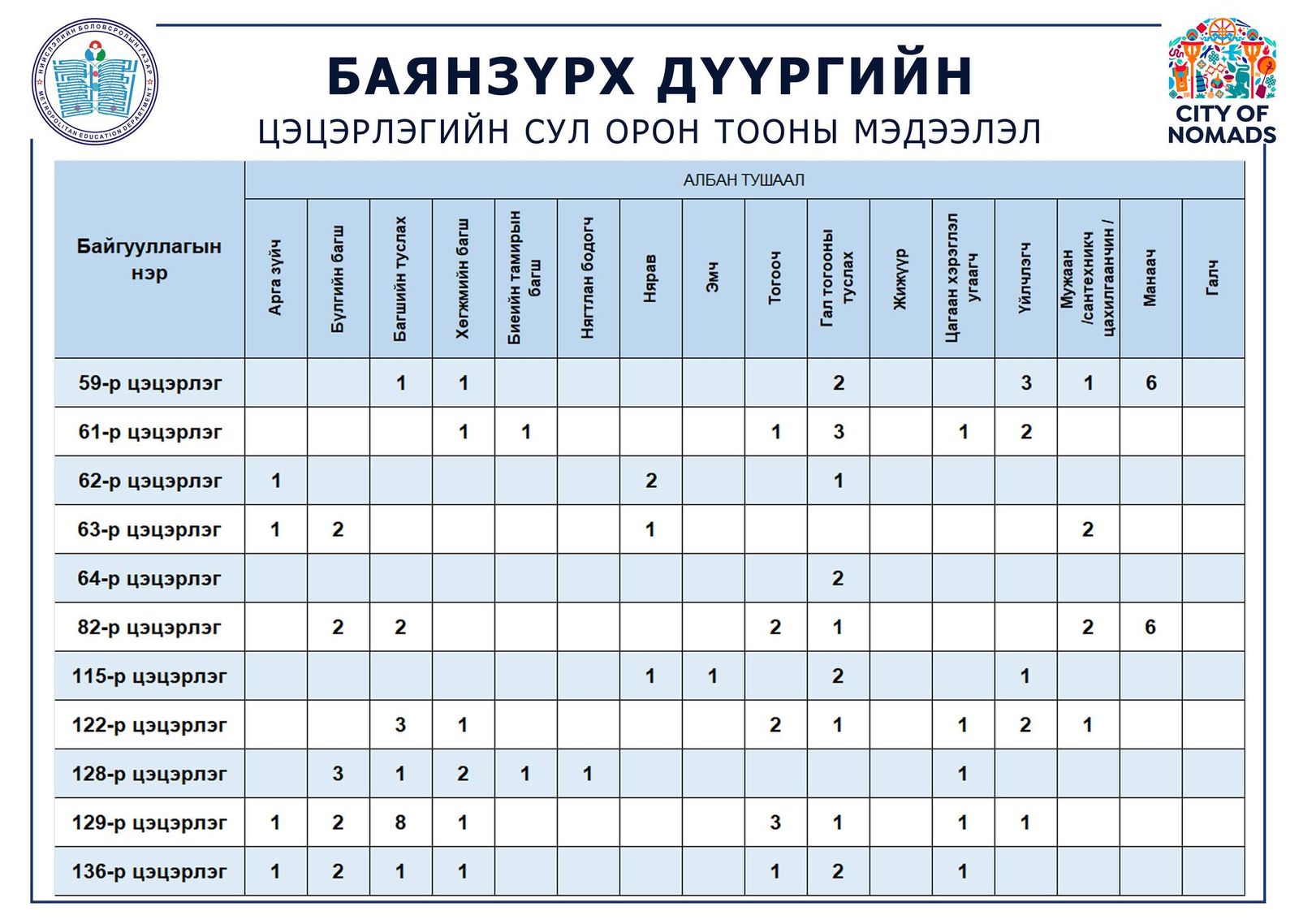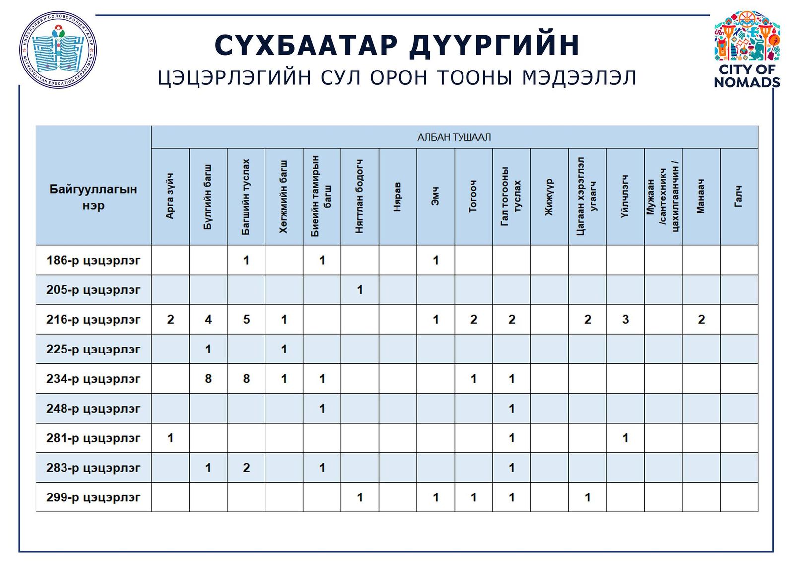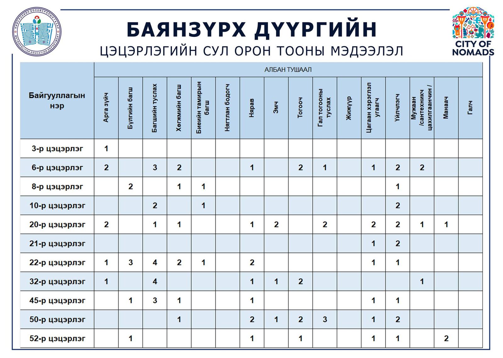 Хамгийн олон ажлын байр зарласан нь Сонгинохайрхан болон Баянзүрх дүүргийн цэцэрлэгүүд байна. Тодруулбал Сонгинохайрхан дүүрэгт үйл ажиллагаа явуулдаг 60, Баянзүрх дүүргийн 56 цэцэрлэг сул орон тоо зарлаад байна.