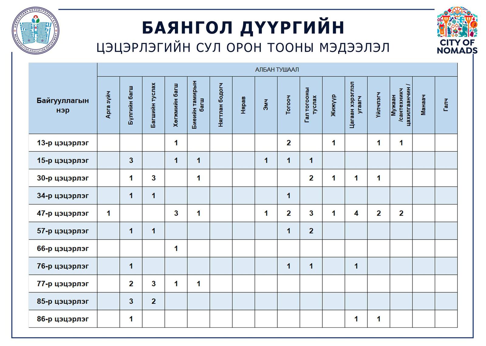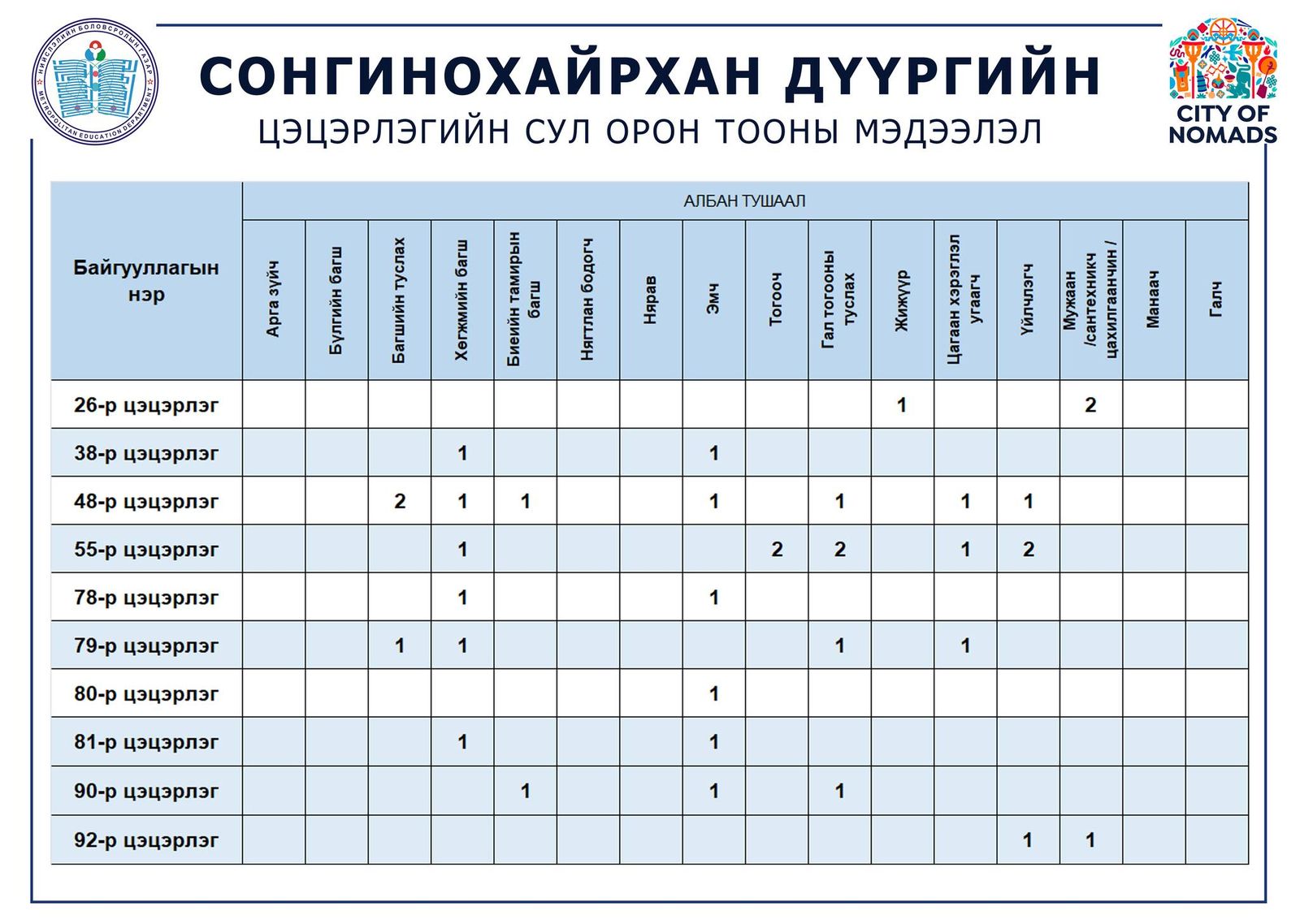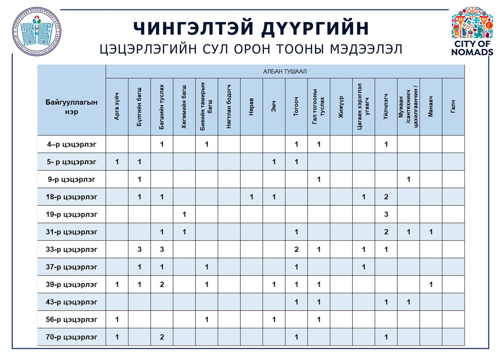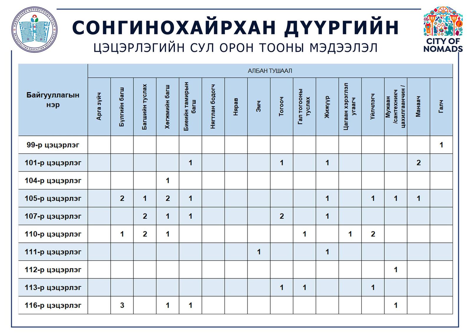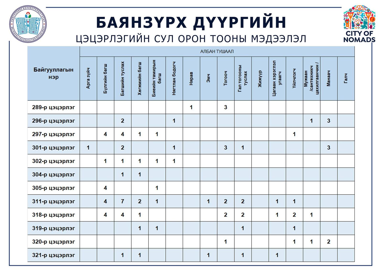 Хамгийн олон ажлын байр зарласан нь Сонгинохайрхан болон Баянзүрх дүүргийн цэцэрлэгүүд байна. Тодруулбал Сонгинохайрхан дүүрэгт үйл ажиллагаа явуулдаг 60, Баянзүрх дүүргийн 56 цэцэрлэг сул орон тоо зарлаад байна.
