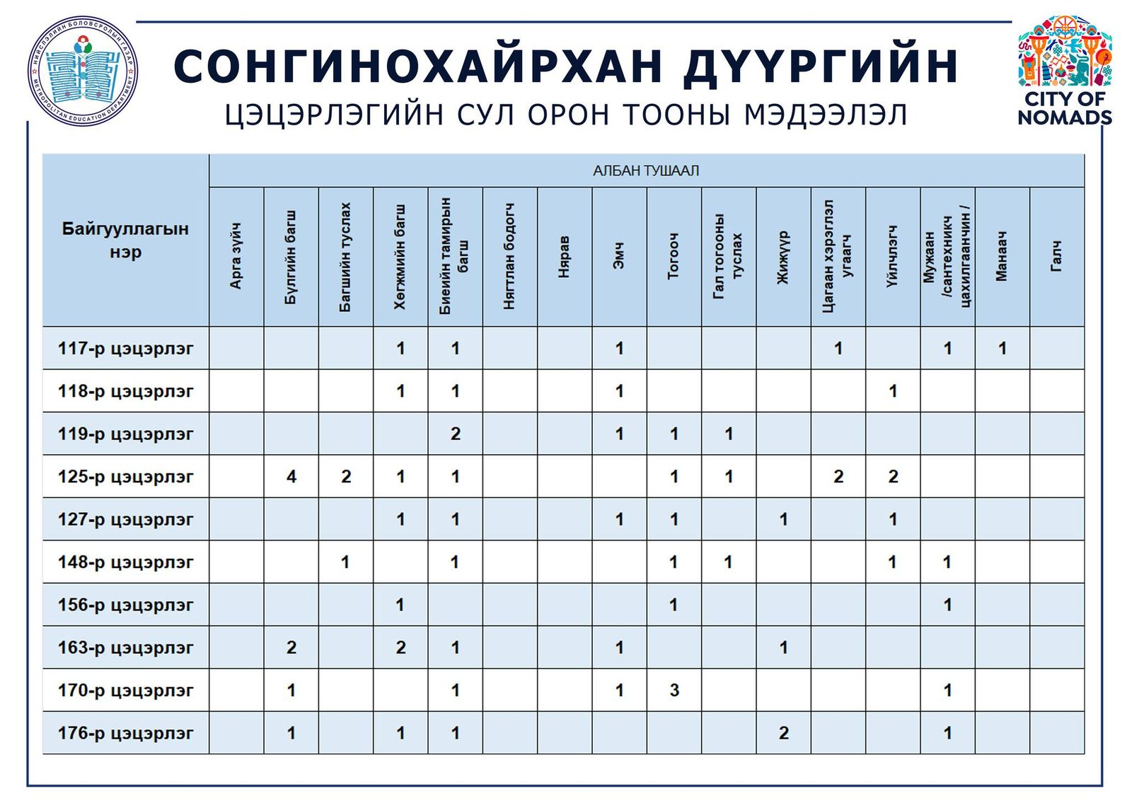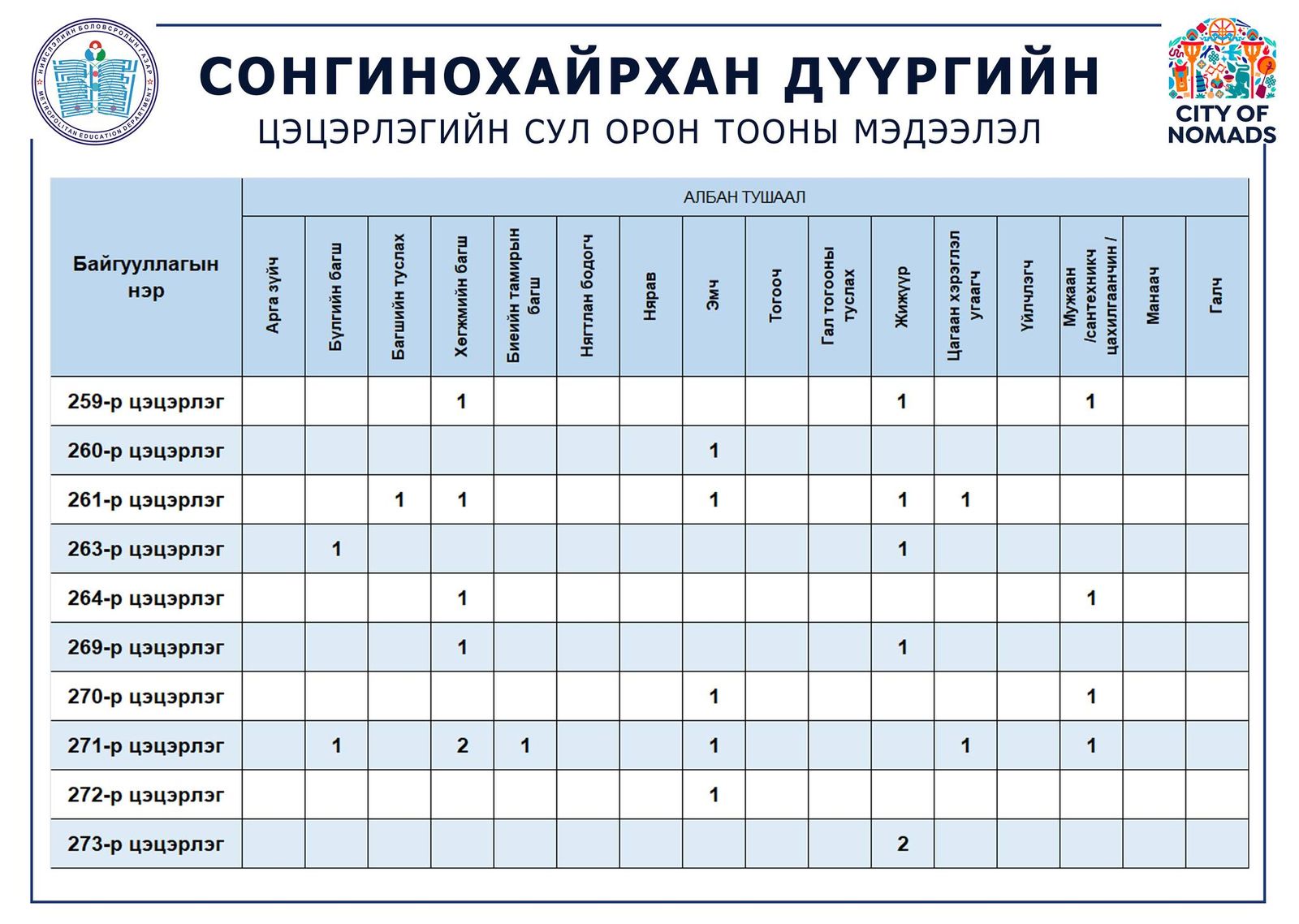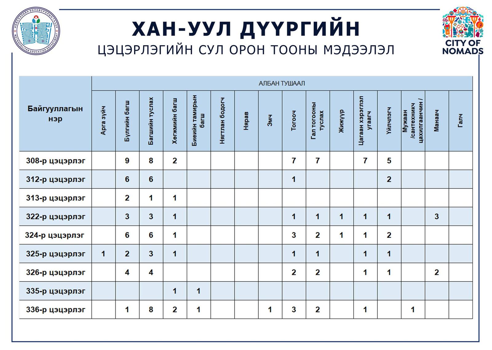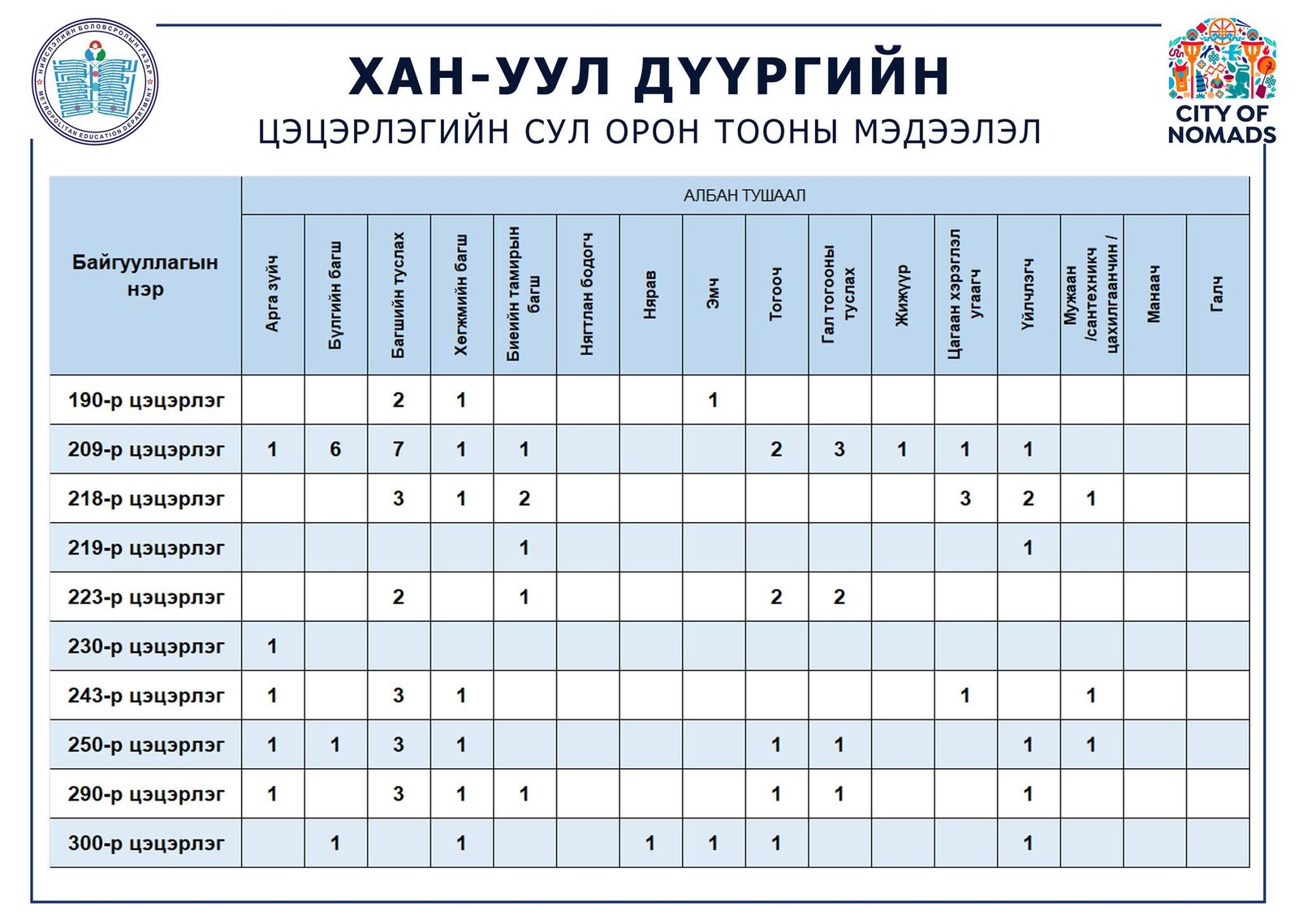 Хамгийн олон ажлын байр зарласан нь Сонгинохайрхан болон Баянзүрх дүүргийн цэцэрлэгүүд байна. Тодруулбал Сонгинохайрхан дүүрэгт үйл ажиллагаа явуулдаг 60, Баянзүрх дүүргийн 56 цэцэрлэг сул орон тоо зарлаад байна.