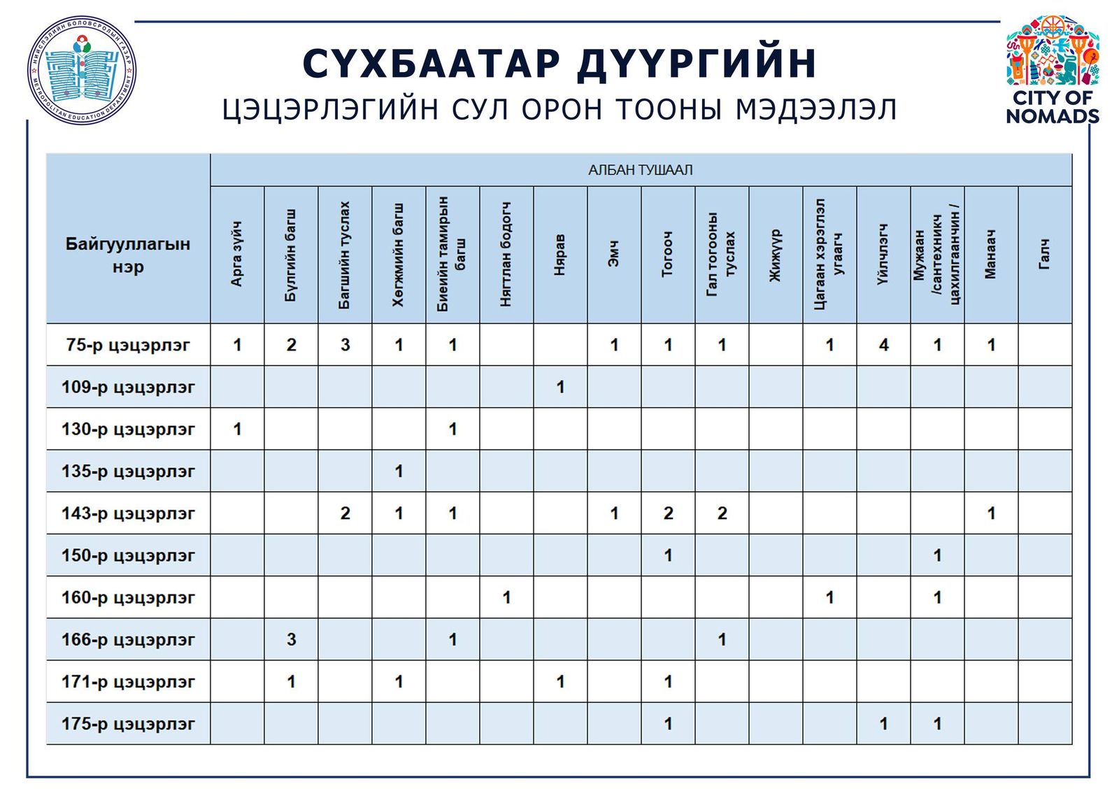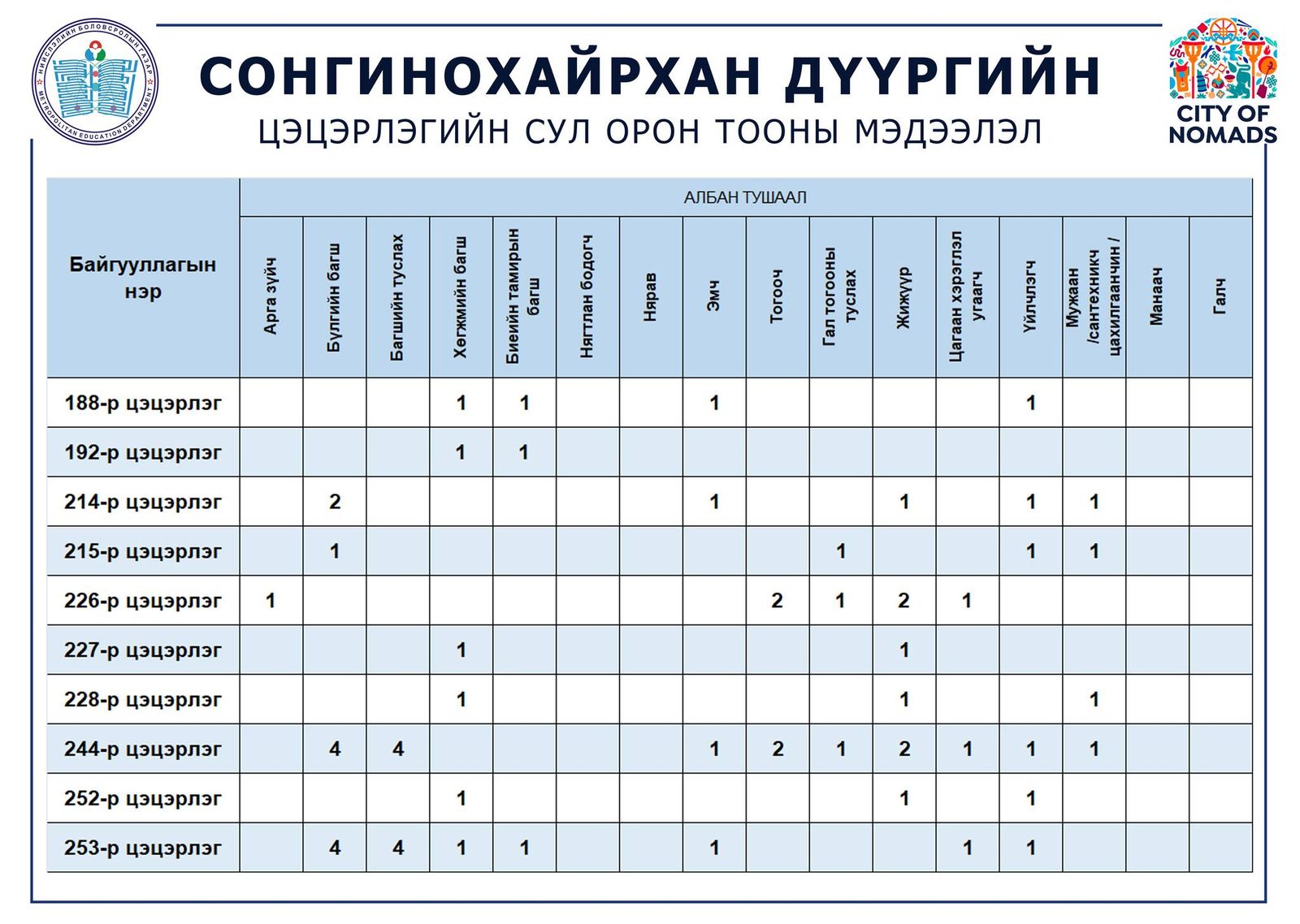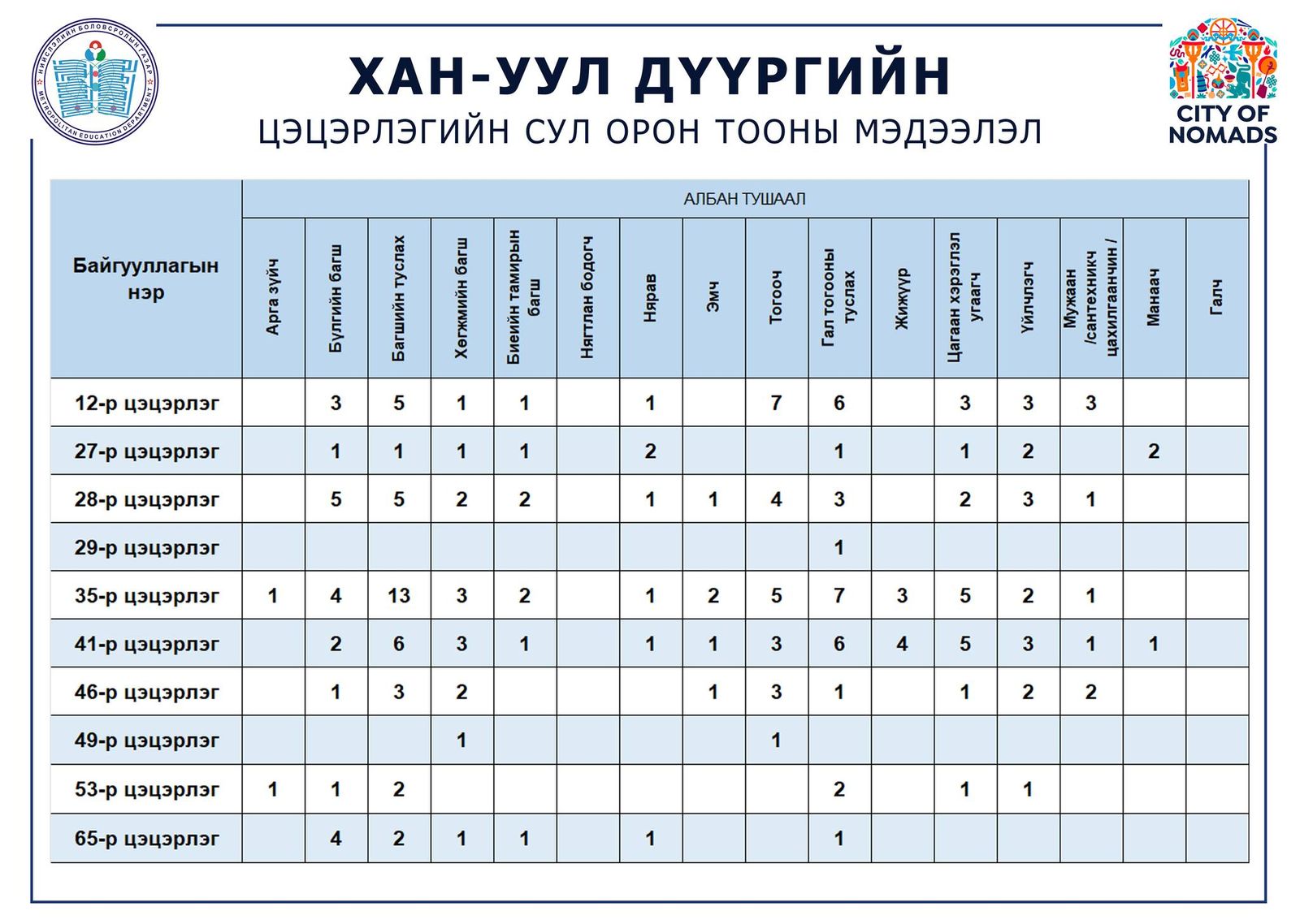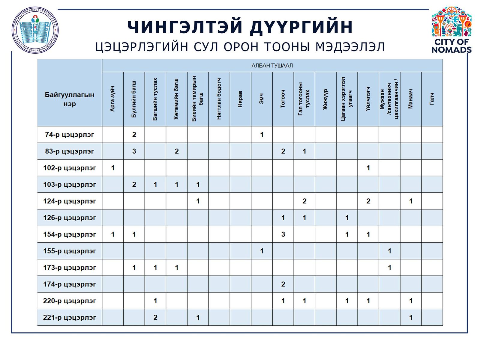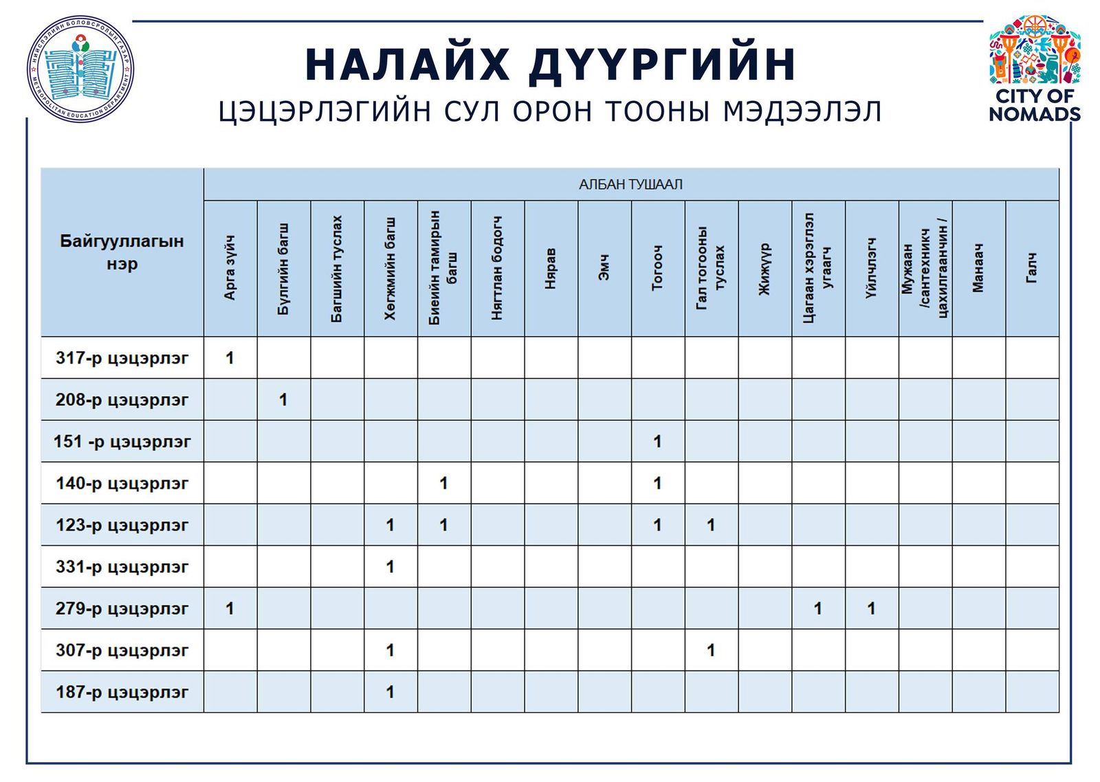 Хамгийн олон ажлын байр зарласан нь Сонгинохайрхан болон Баянзүрх дүүргийн цэцэрлэгүүд байна. Тодруулбал Сонгинохайрхан дүүрэгт үйл ажиллагаа явуулдаг 60, Баянзүрх дүүргийн 56 цэцэрлэг сул орон тоо зарлаад байна.