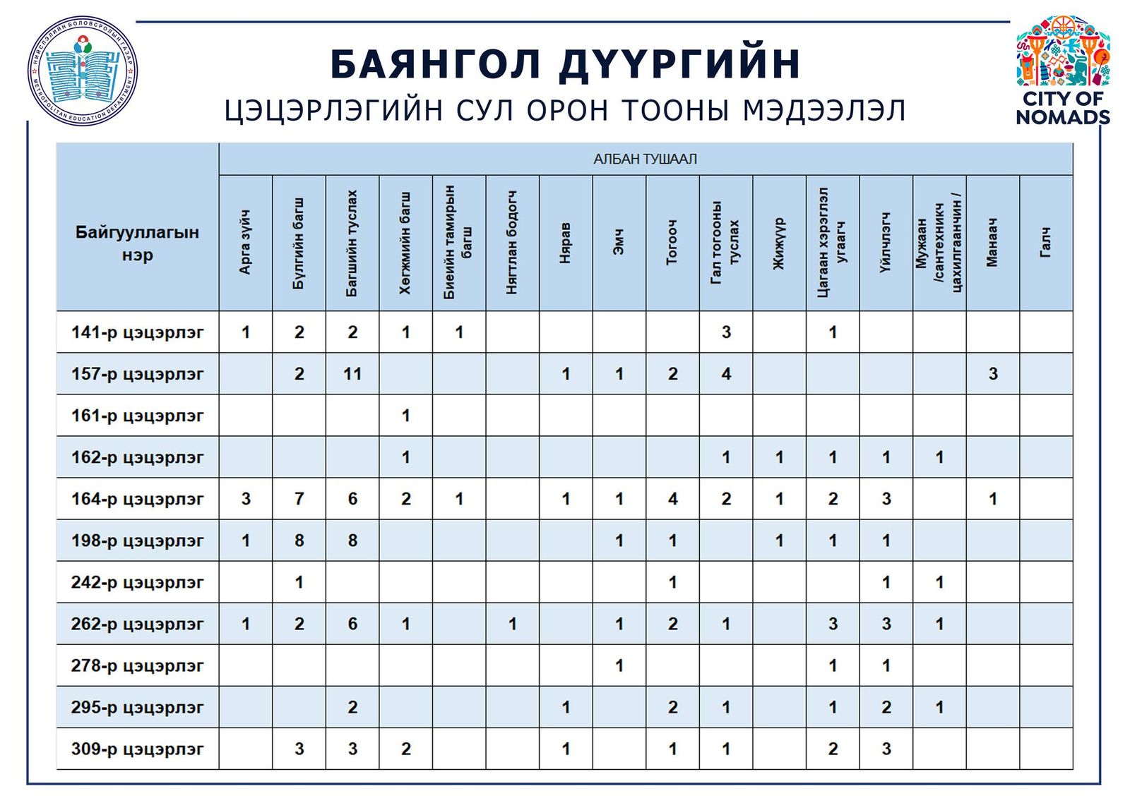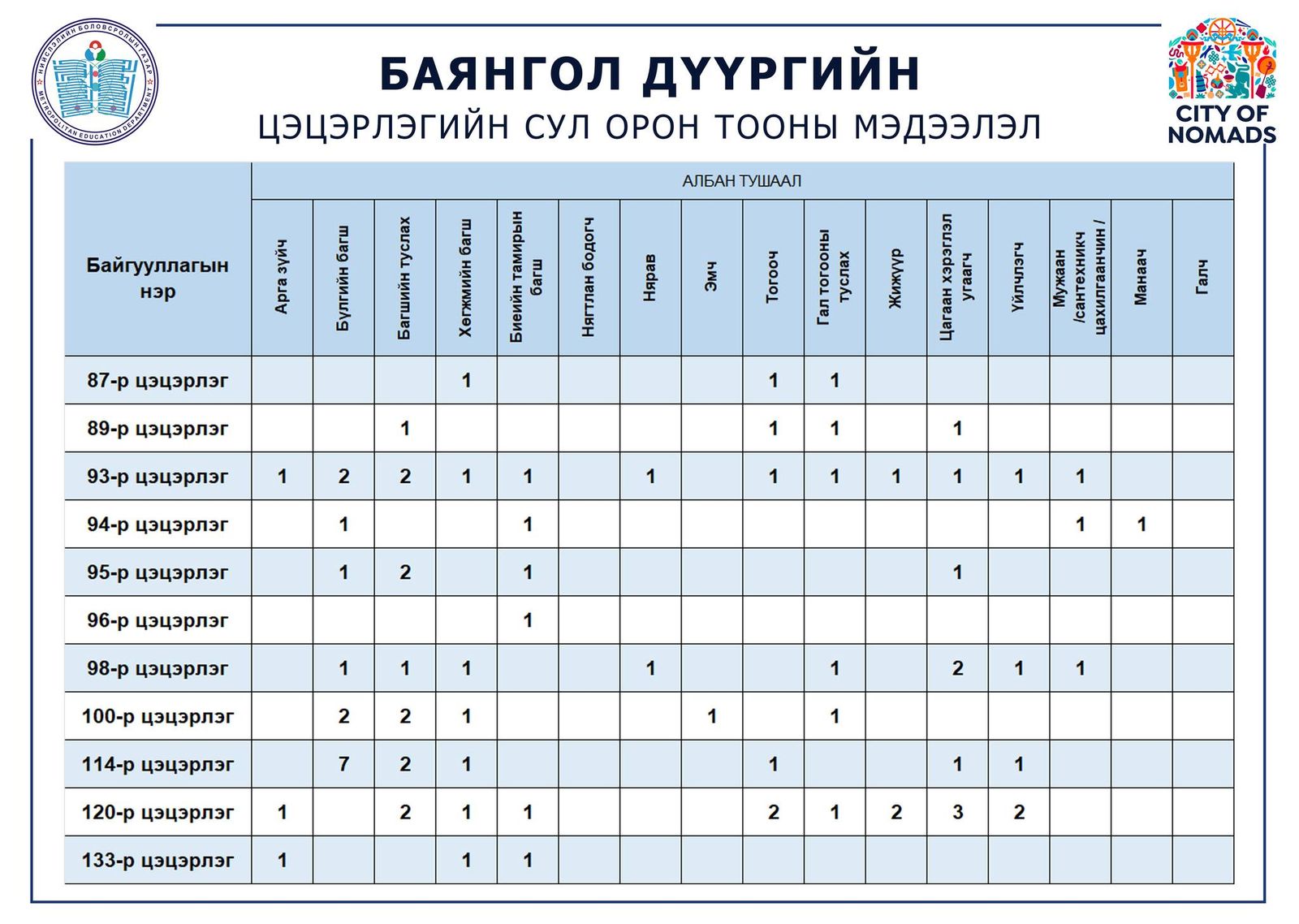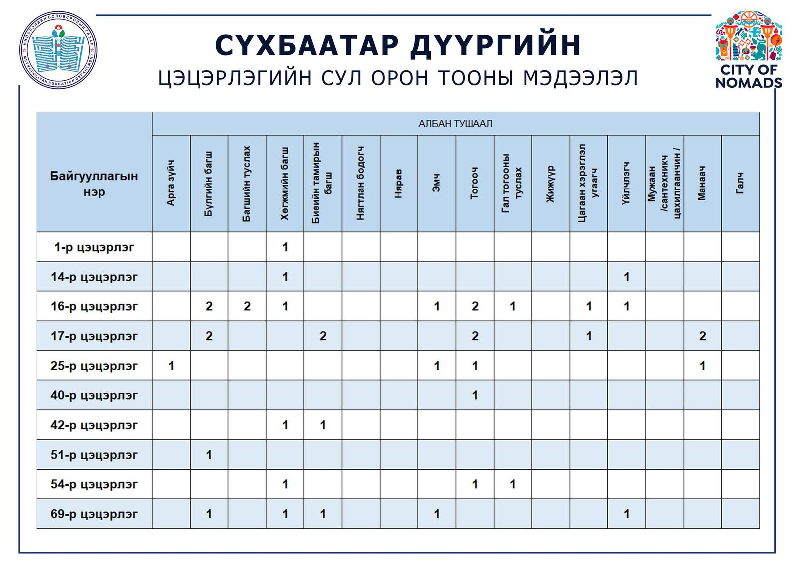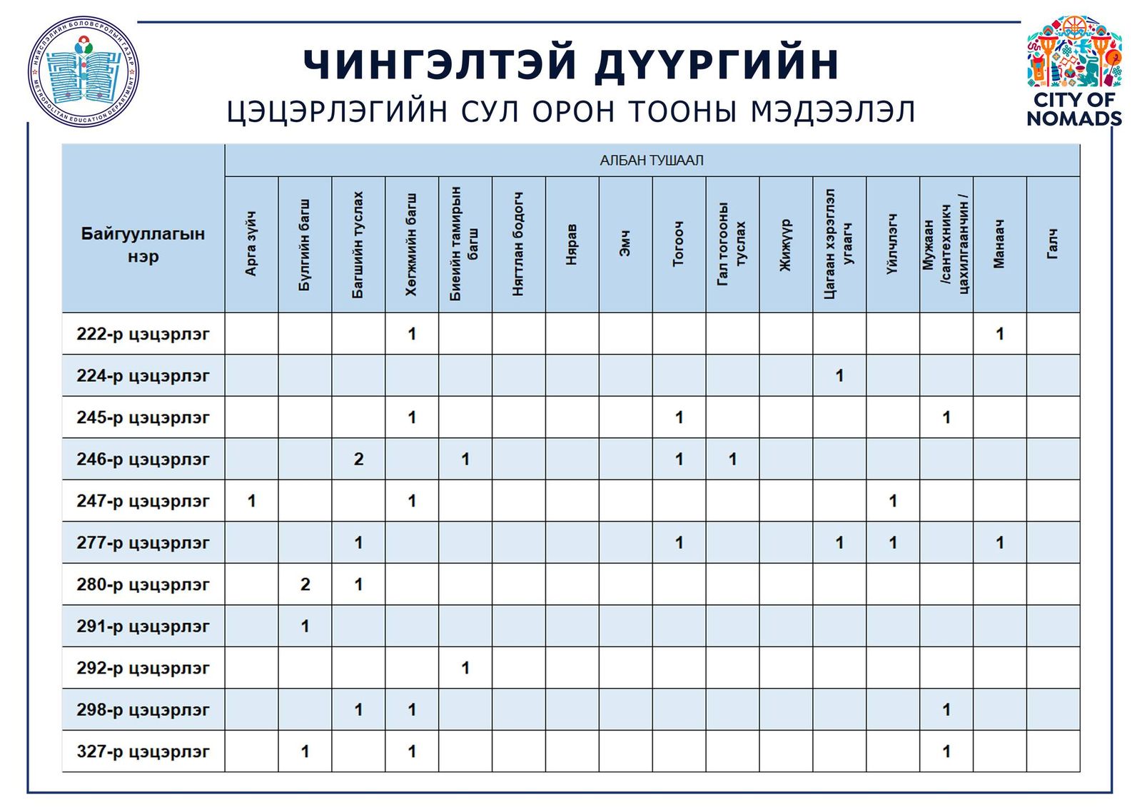 Хамгийн олон ажлын байр зарласан нь Сонгинохайрхан болон Баянзүрх дүүргийн цэцэрлэгүүд байна. Тодруулбал Сонгинохайрхан дүүрэгт үйл ажиллагаа явуулдаг 60, Баянзүрх дүүргийн 56 цэцэрлэг сул орон тоо зарлаад байна.