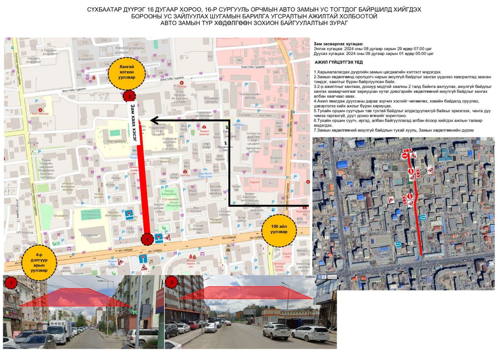 Сүхбаатар дүүргийн 16 дугаар хороо, 16 дугаар сургууль орчмын авто замыг түр хугацаанд хааж, засварлана.