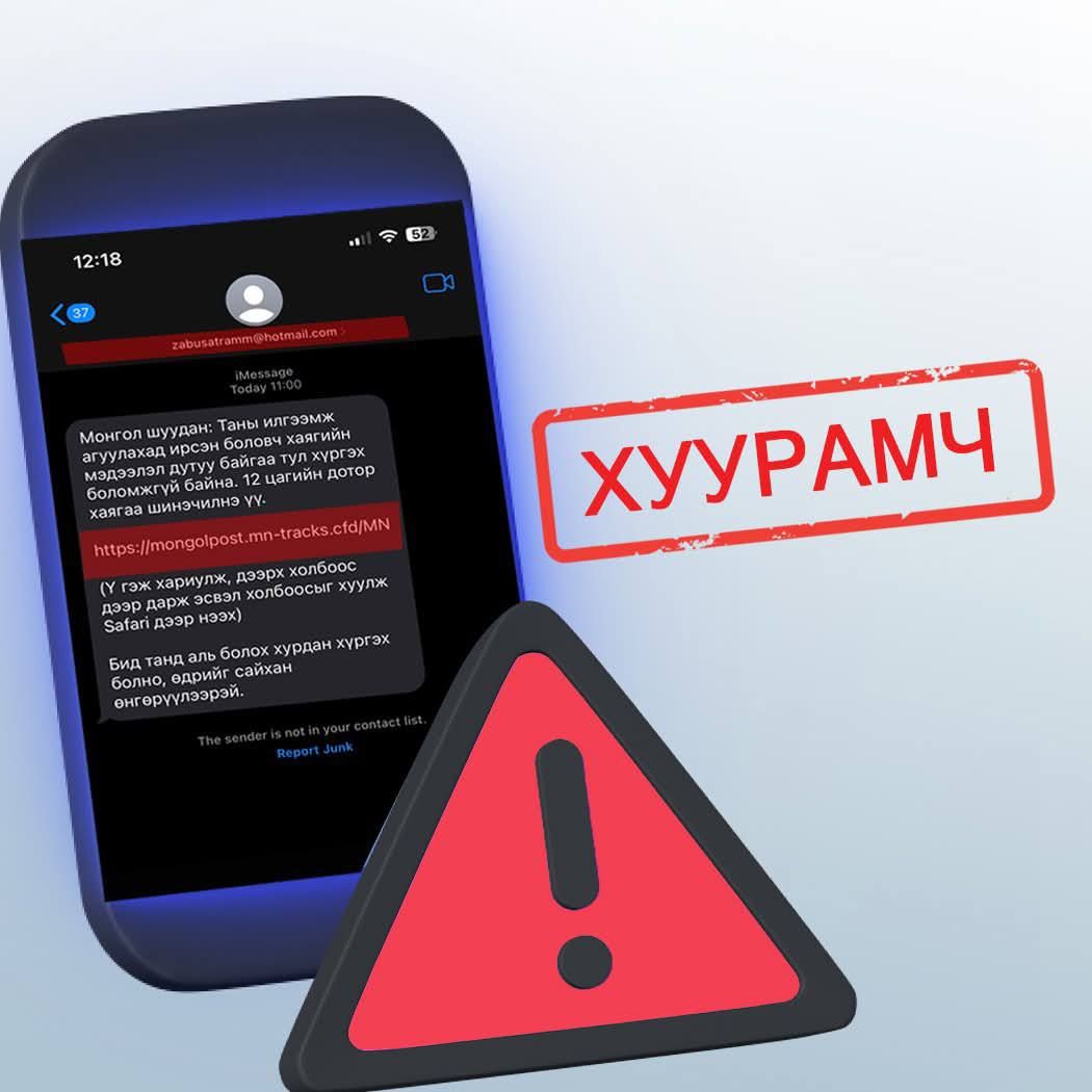 Сүүлийн үед "Монгол шуудан: Хүчингүй шуудангийн хаяг илэрсэн тул илгээмжийг бөглөх боломжгүй бөгөөд линк дэх шуудангийн хаягийн мэдээллийг 24 цагийн дотор баталгаажуулна уу. htts://mongolpost.mn-check.lol/MN (Y гэж хариулж, мессэжээс гараад холбоосыг идэвхжүүлэхийн тулд дахин нээнэ үү. Эсвэл холбоосыг Safari хөтөч дээрээ хуулж аваад нээнэ үү) Бид танд аль болох хурдан хүргэх болно, өдрийг сайхан өнгөрүүлээрэй."