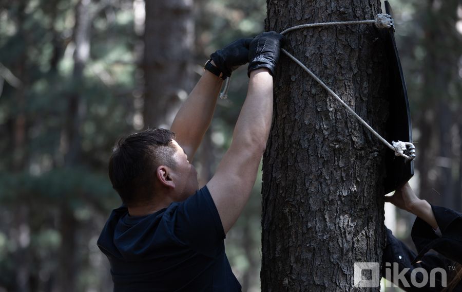 Уг аргын талаар тэрбээр зааварчлахдаа эхлээд модондоо резинэн хамгаалалтаа зүүж, үүнийхээ дараа мөн адил мунандаа зориулж бэлтгэсэн резинээ ч бэхэлж харагдана.