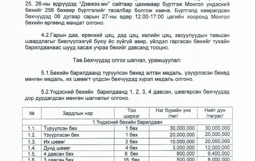 Хөтөлбөр ёсоор хүчит 256 бөхийн барилдааны нэгийн даваа Хүй долоо худаг дахь Монгол наадам цогцолборын төв талбайд зургаадугаар сарын 28-нд эхэлж, хоёр өдөр үргэлжилнэ. Энэ үеэр бөхийн цол, чимэг олгохгүй. Үндэсний бөхийн барилдаанд түрүүлсэн бөхөд 30 сая, үзүүрлэсэн бөхөд 20 сая төгрөгийн шагнал өгөх бол нэг давсан 64 бөх тус бүрийг 150,000 төгрөгөөр шагнах юм байна. Бөхийн бай шагналд нийт 124.4 сая төгрөг зарцуулна.