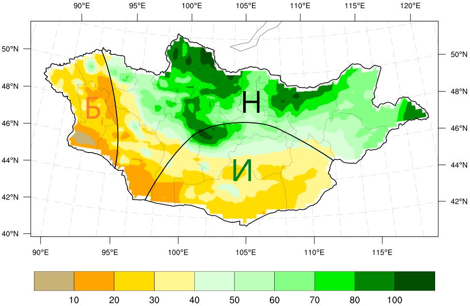 Долдугаар сарын хур тунадасны ОЖД болон энэ жилийн долдугаар сарын урьдчилсан төлөв. /И–хур тунадас ОЖД–аас ахиу, Н–хур тунадас ОЖД–ийн орчим, Б–хур тунадас ОЖД–аас бага/
