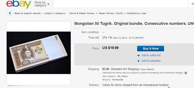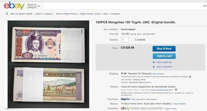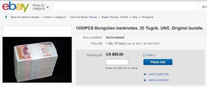 Өнөөдөр бидний ашиглаж байгаа Монгол мөнгөн дэвсгэртүүдийг "eBay" сайтад "Хятадаас" гэсэн нэрээр худалдаалж байна. Тухайлбал манай 20 төгрөгний 10 боодол дэвсгэртийг буюу 20 мянган төгрөгийг тус сайтад 90 - 110 ам.доллар, тавтын боодлыг 65 ам.доллараар худалдаалж байна.