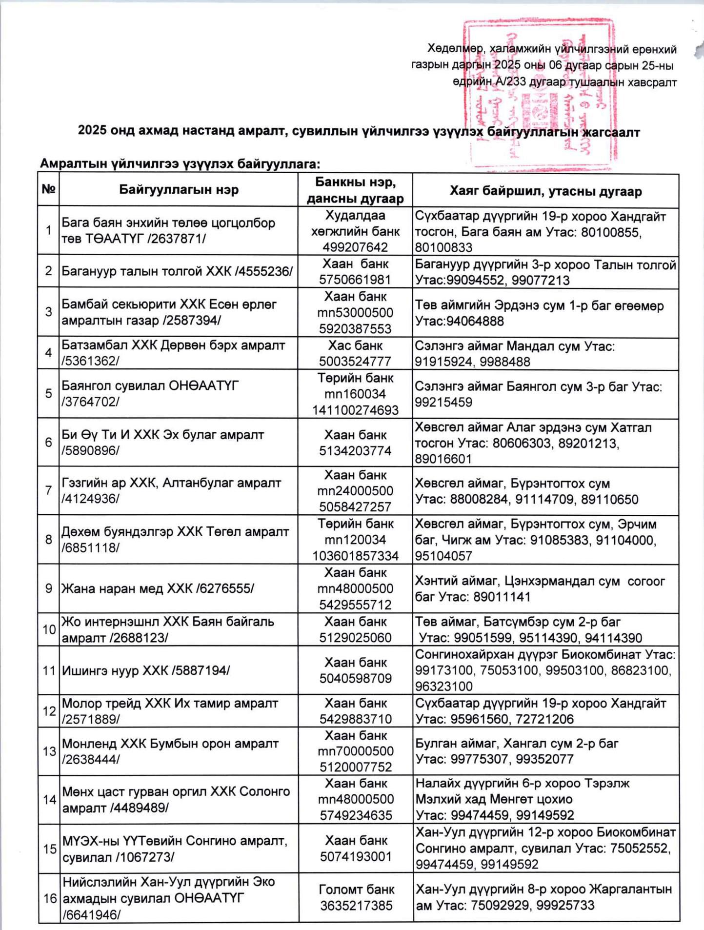 Ахмад настны тухай хуулийн 8 дугаар зүйлийн 8.1.2-т заасан эрхийн бичгийн хөнгөлөлттэй үнээр ахмад настанд амралт, сувиллын үйлчилгээ үзүүлэх байгууллагын жагсаалт гаргах ажлын хэсгийг Хөдөлмөр, халамжийн үйлчилгээний ерөнхий газрын даргын 2025 оны 06 дугаар сарын 02-ний өдрийн “Ажлын хэсгийн байгуулах тухай” А/197 дугаар тушаалаар байгуулан, батлагдсан шалгуурын дагуу жагсаалтад орох байгууллагын материалыг 2025 оны 06 дугаар сарын 03-ний өдрөөс 2025 оны 06 дугаар сарын 17-ны өдөр хүртэл хүлээн авч үнэлгээ хийн, шалгуур хангасан амралтын 31 байгууллага, сувиллын 24 байгууллага, нийт 55 байгууллагатай Хөдөлмөр, халамжийн үйлчилгээний ерөнхий газрын даргын 2025 оны 06 дугаар сарын 25-ны өдрийн “Гэрээ байгуулах тухай” А/233 дугаар тушаалаар гэрээ байгуулан, 2025 онд эрхийн бичгийн хөнгөлөлттэй үнээр ахмад настанд амралт, сувиллын үйлчилгээ үзүүлэх байгууллагын жагсаалтыг аймаг, дүүргийн Хөдөлмөр, халамжийн үйлчилгээний газар, хэлтэст хүргүүллээ.