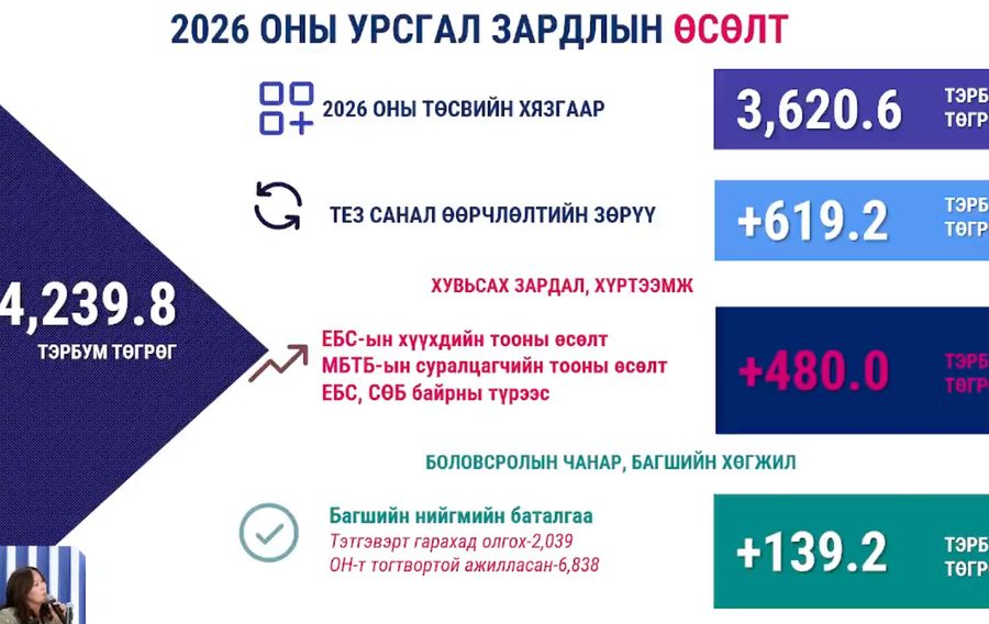 Ажил олгогчоос олгох тэтгэмж, урамшуулал дэмжлэг 47.7 тэрбум төгрөг, тоног төхөөрөмжийн нөхөн хангалтын зардал л 66 хувиар нэмэгдэж, 5.8 тэрбум төгрөг байхаар тооцлоо.
